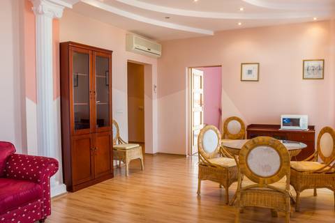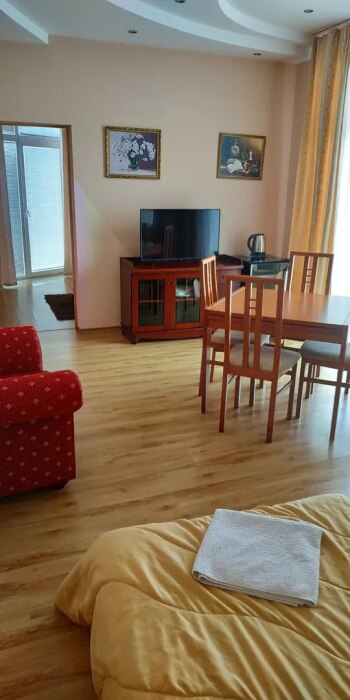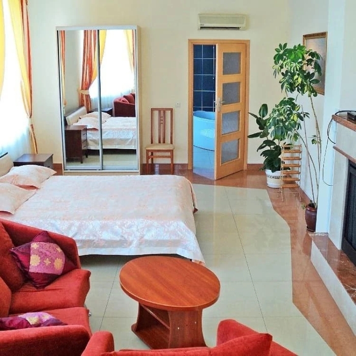Просторный уютный 2-комнатный номер находиться в прохладной части виллы. Семье с детьми будет очень удобно сесть за большой стол. Все необходимое для комфортного отдыха. Полотенца халаты тапочки фен эл. чайник и посуда.