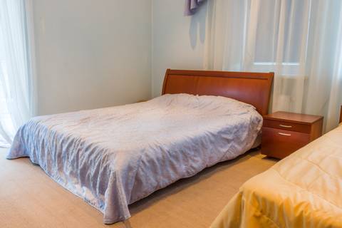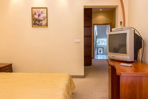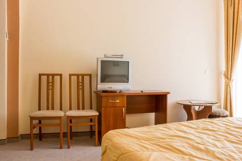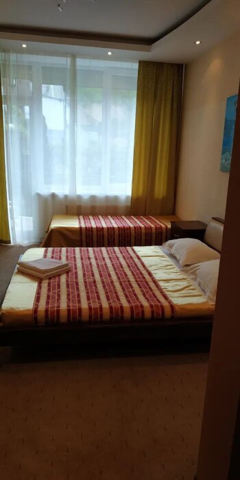 В номере двуспальная или две односпальные кровати. Также есть весь набор полотенец, халаты. Фен, электрочайник, посуда, Утюгом можно пользоваться в специально отведенном месте. Смарт ТВ.