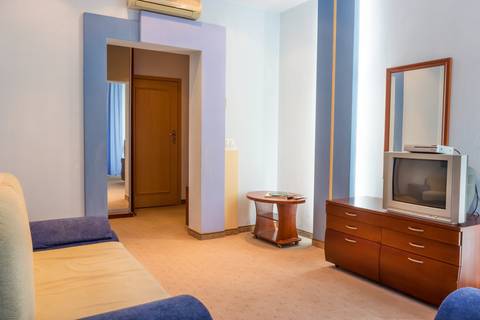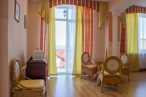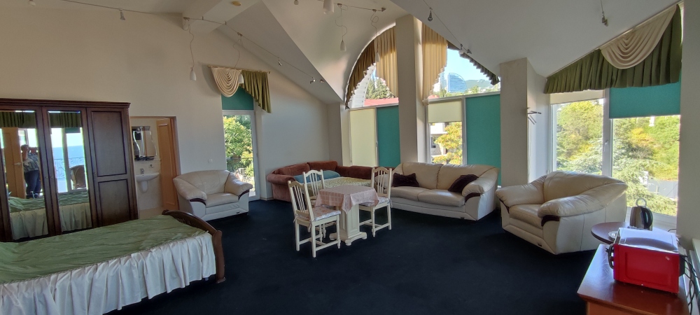 Шикарный комфортный 2-комнатный люкс с видом на море. Терраса позволяет, не выходя из номера, принимать солнечные ванны и посиделки за чашкой чая. Семье из 5 человек будет вполне комфортно разместиться.