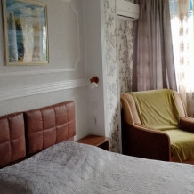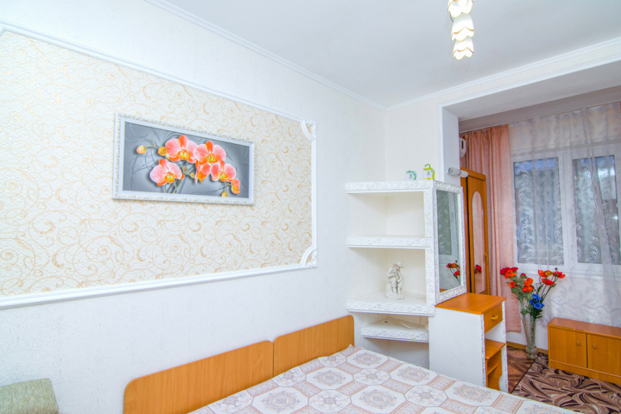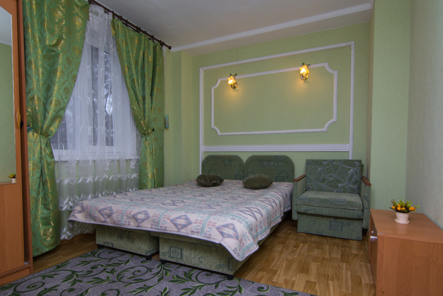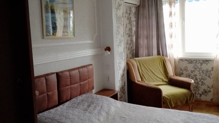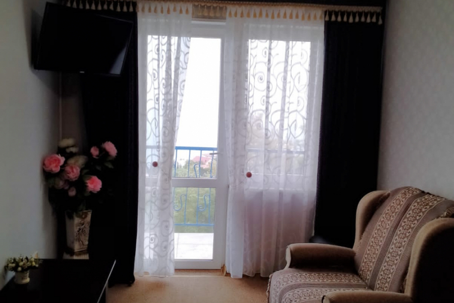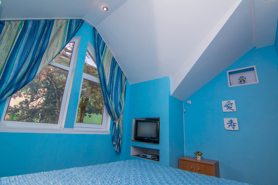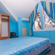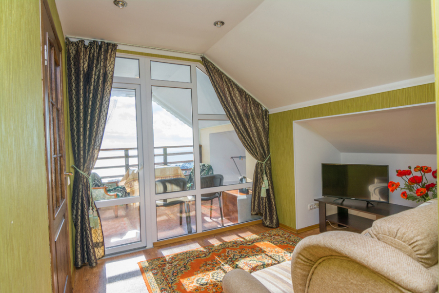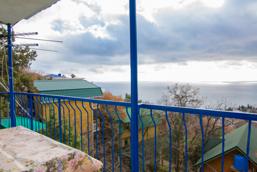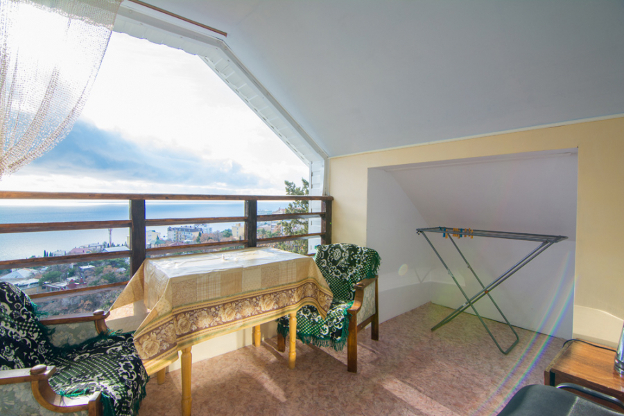 Находится на третьем этаже и состоит из двух комнат. Просторная светлая спальня с большим панорамным окном в сторону моря, двуспальная кровать. В гостиной удобный диван на два человека и телевизор (спутниковое ТВ). На просторной террасе находится стол для отдыха. С террасы открывается прекрасный вид на море и на южный берег Крыма до Семеиза, wi-fi.