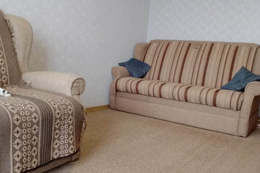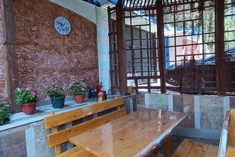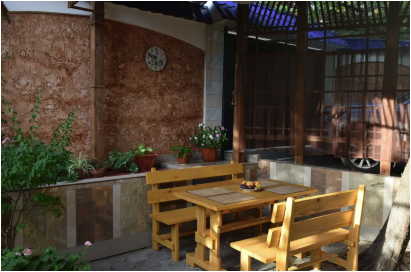 Находится на первом этаже с отдельным входом. Во дворике под навесом оборудовано место для отдыха.