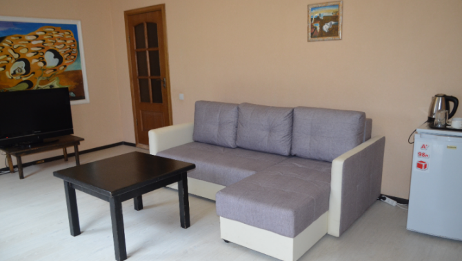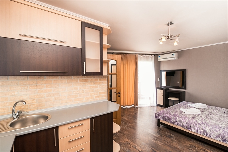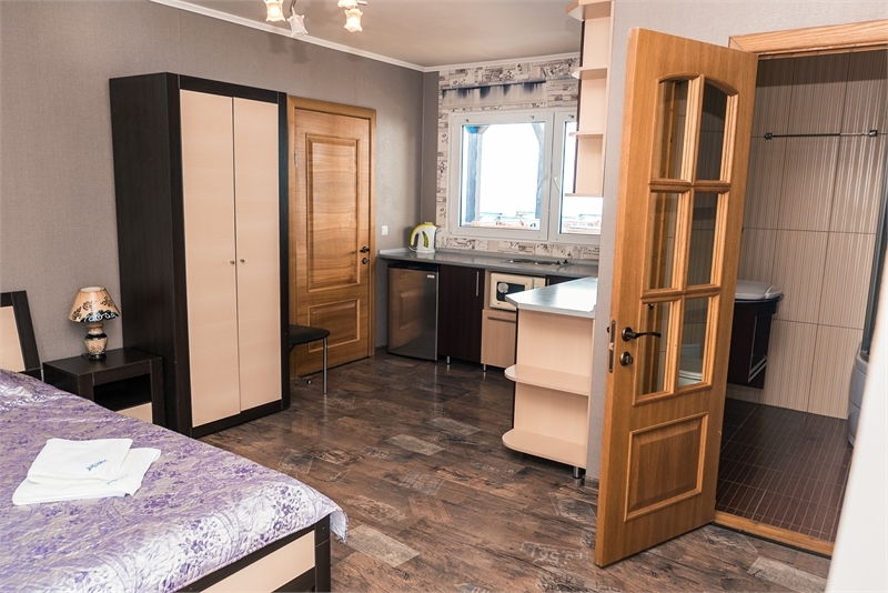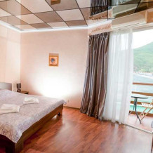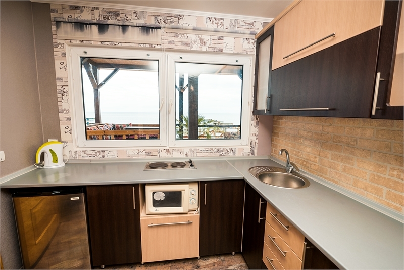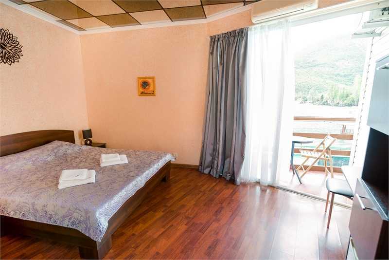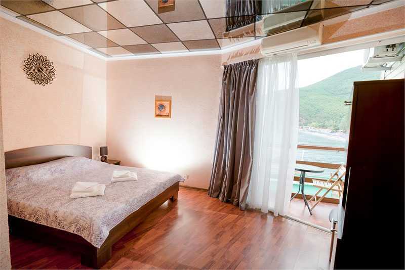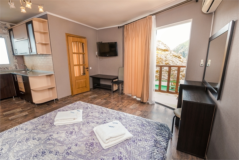 Уютный и просторный однокомнатный номер с кухней на двоих человек с двуспальной кроватью «King» (трансформируется в 2-е раздельные кровати) и с потрясающим видом на черное море и горы. Есть возможность размещения одного дополнительного спального места.
