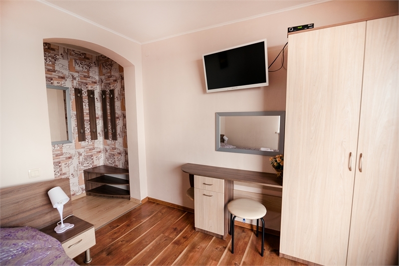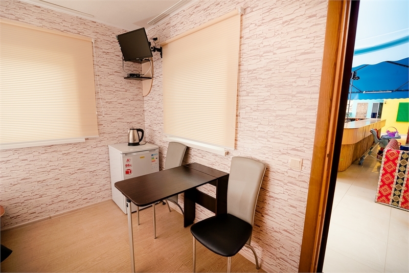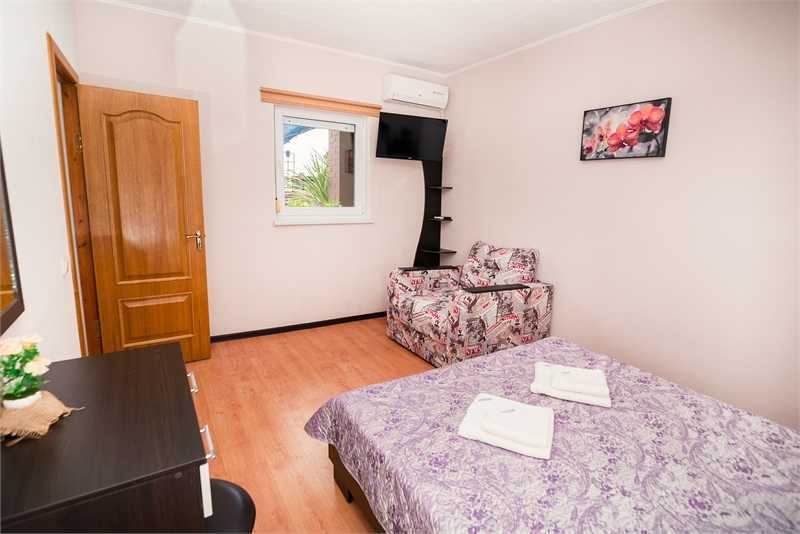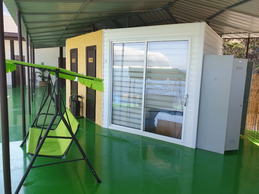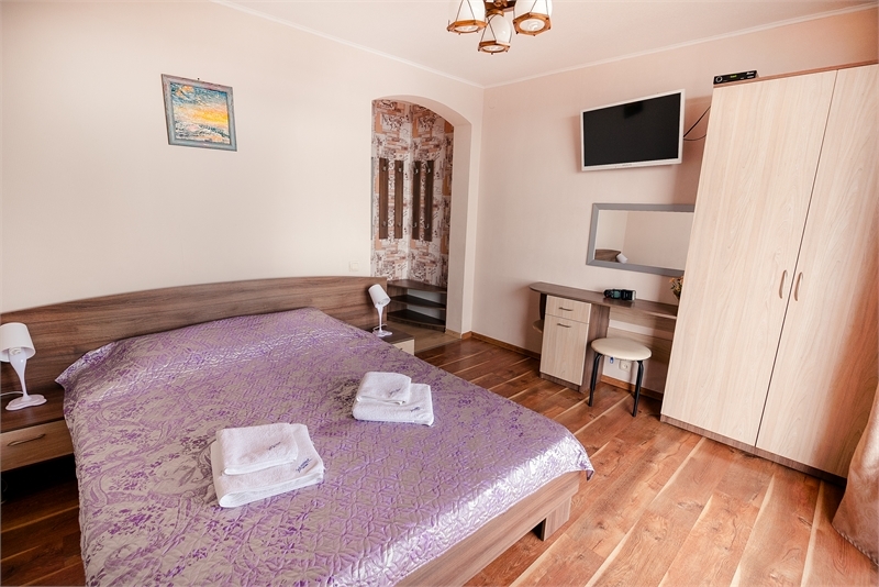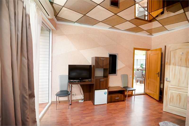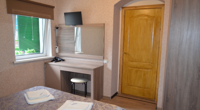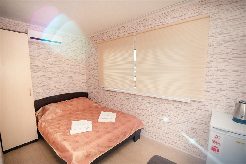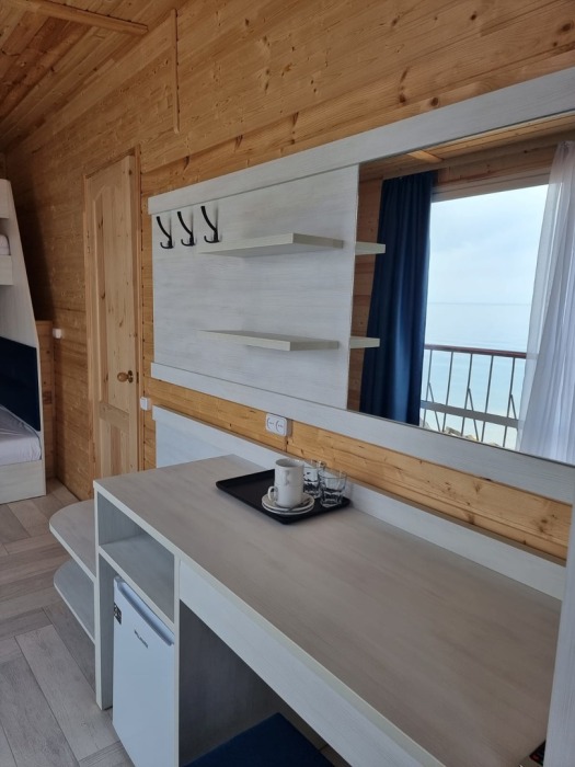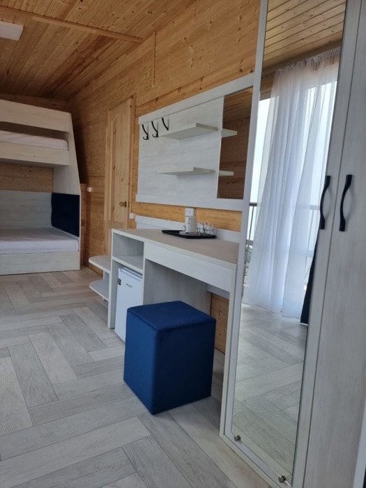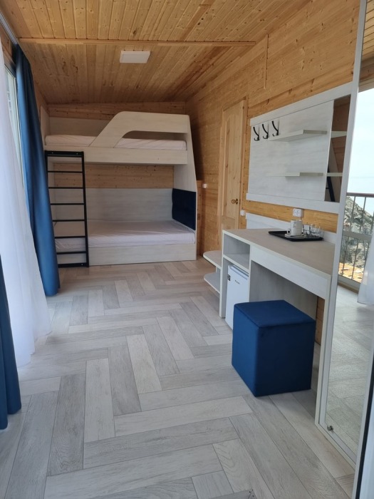 Однокомнатный номер категории стандарт на двоих человек с двухярусной кроватью, с отдельным входом выходящим во внутренний двор отеля. На втором этаже односпальная кровать, где будет удобно расположиться ребёнку, а внизу комфортная двухярусная кровать для родителей. В номере панорамное окно с видом на море.