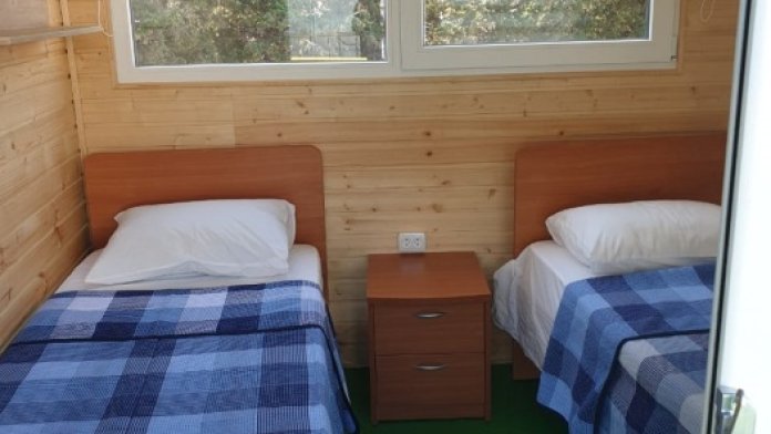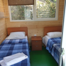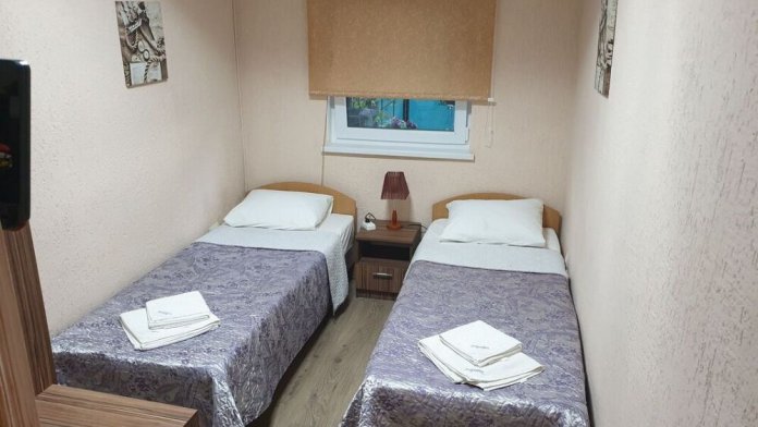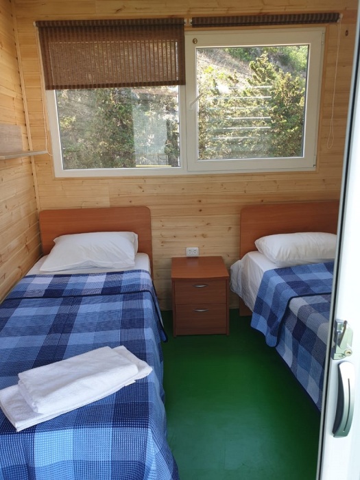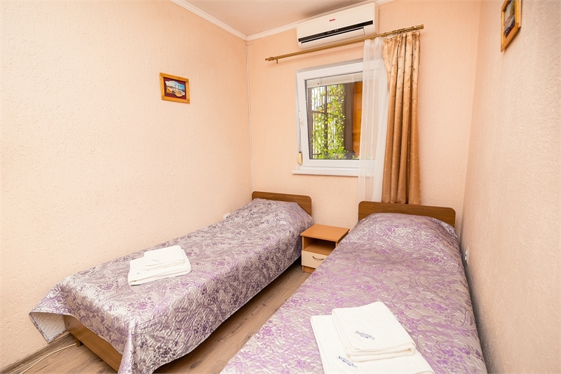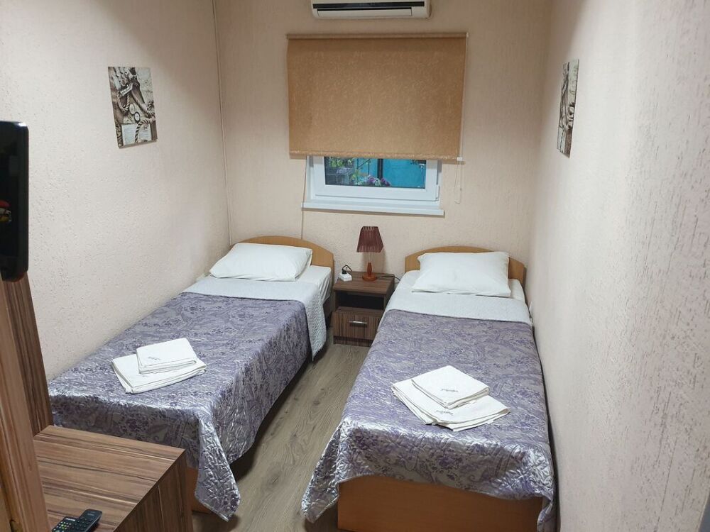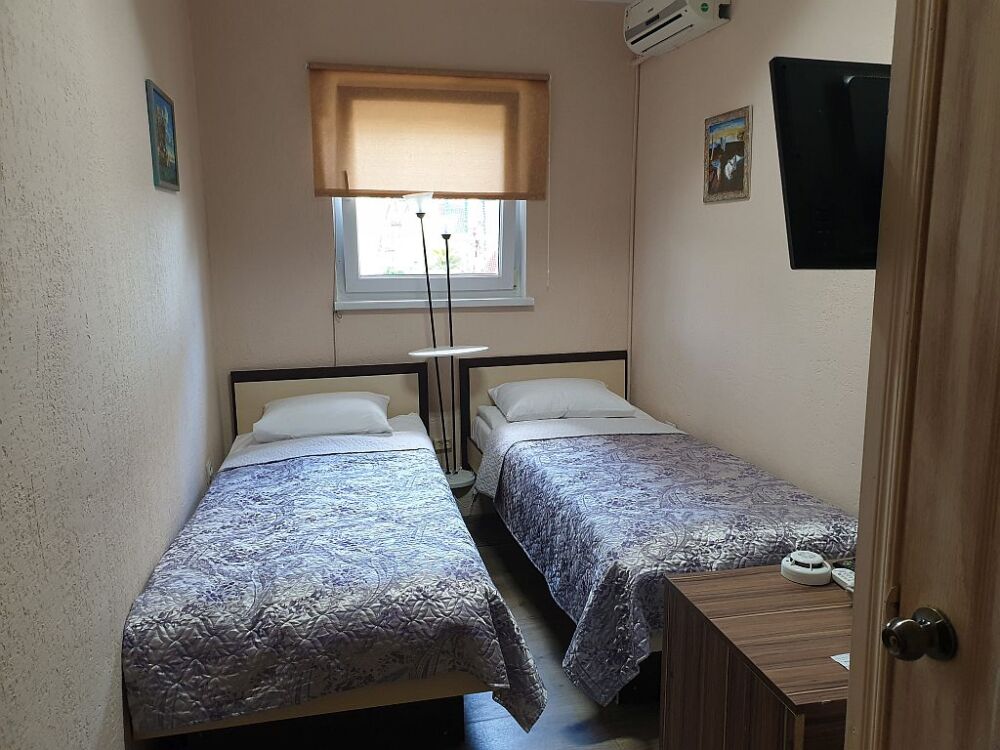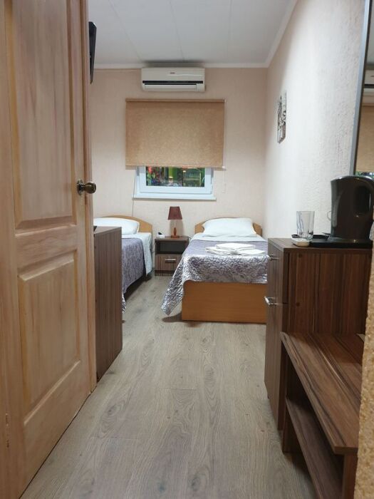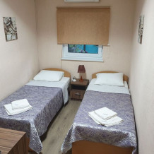 Туалет и раковина в номере, душ общий на этаже. Однокомнатный номер на двоих человек с двумя спальными местами (кровати-«твин»), 1-й этаж. Площадь номера: 12 кв.м. Душ общий – на этаже.