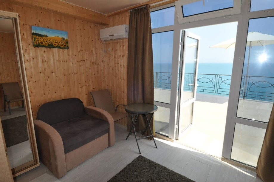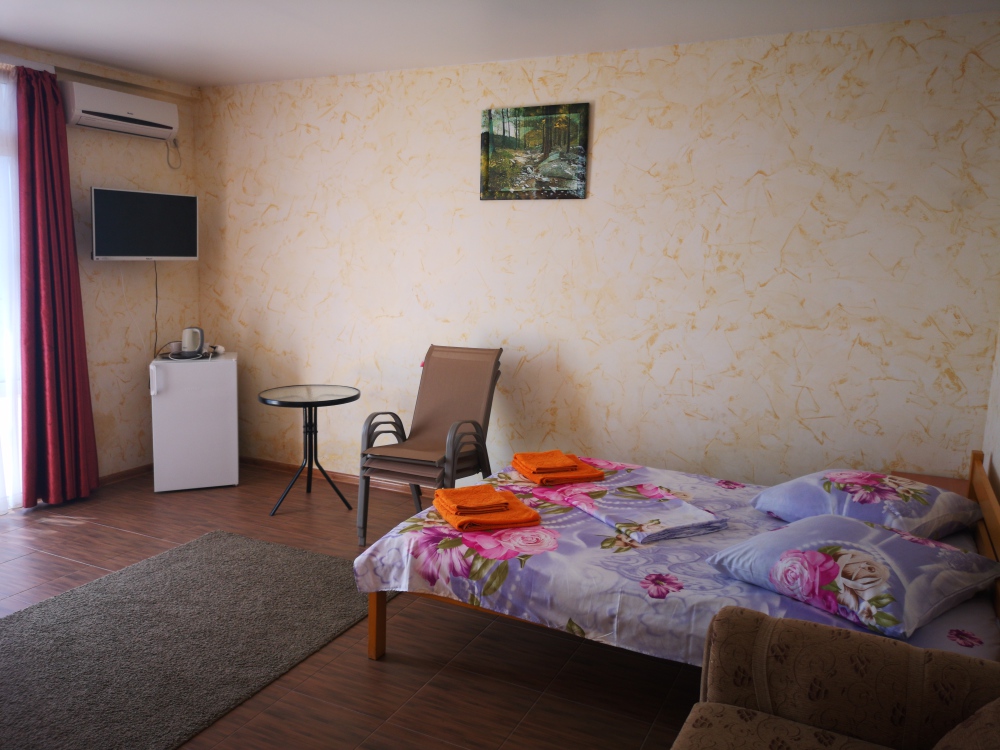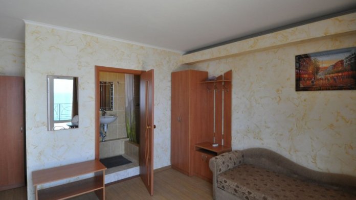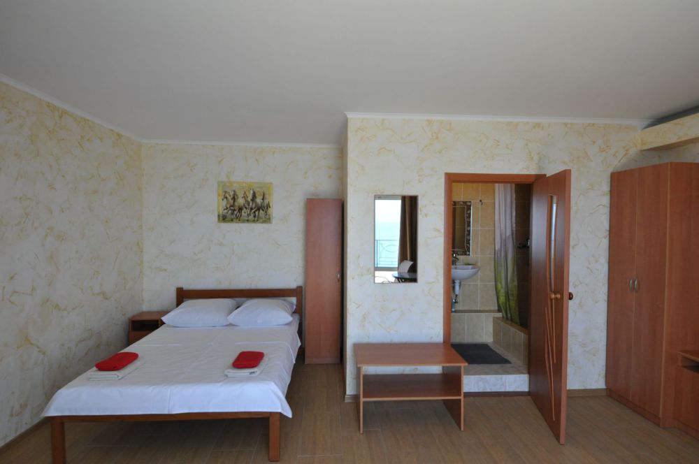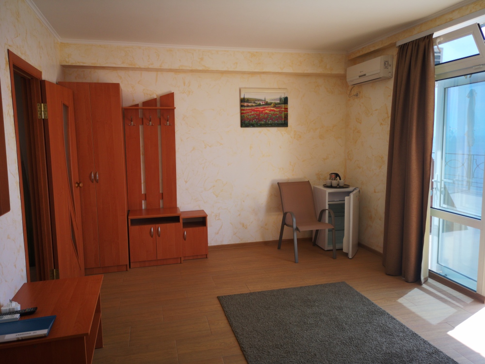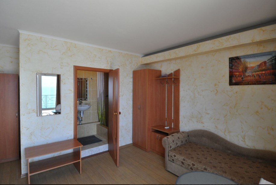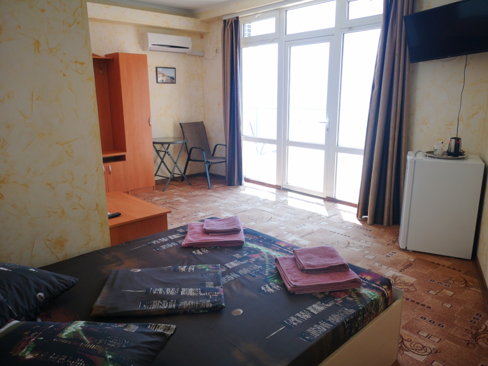 Улучшенный, с повышенной комфортностью и видом на море. В номере имеются: кондиционер, двухспальная кровать, кресло-кровать, шкаф, комод, столик, кресла, зеркало, телевизор, холодильник, электрический чайник с набором чашек, свой санузел+душ (одноразовый гель для душа, шампунь, жидкое мыло во флаконе с дозатором, туалетная бумага, большое и маленькое полотенца). Уборка номера раз в 3-4 дня, замена постельного белья - раз в пять дней.