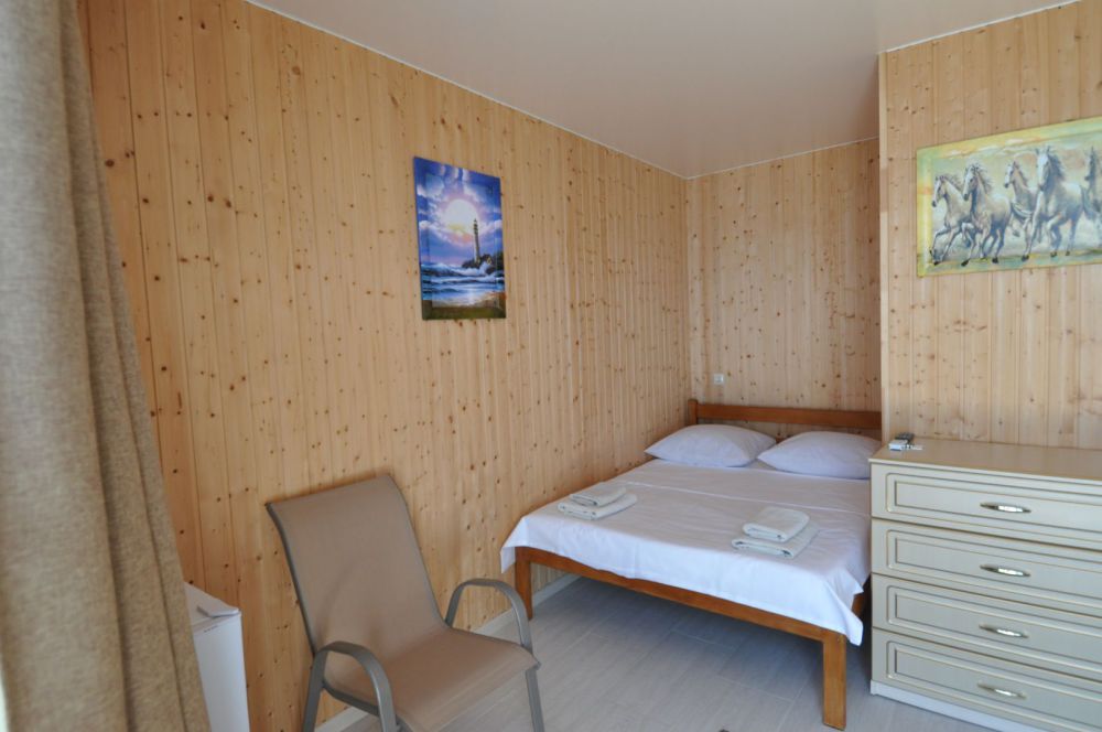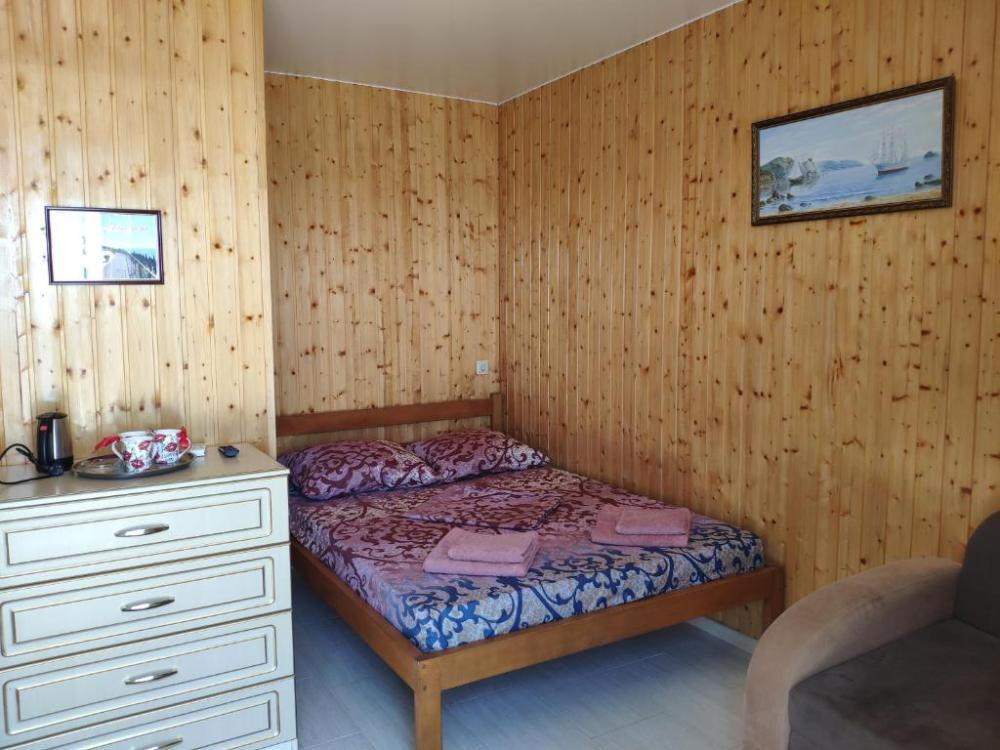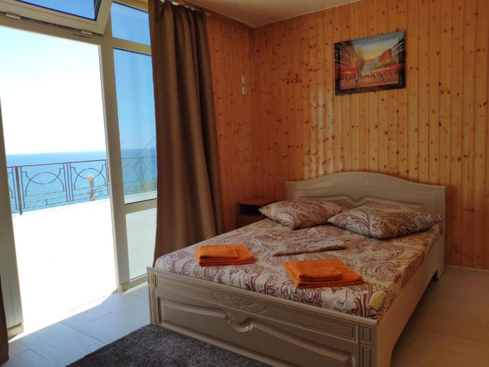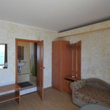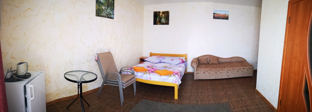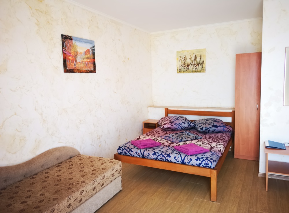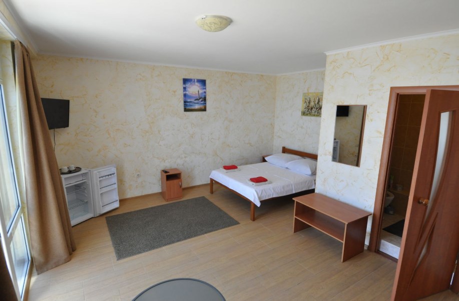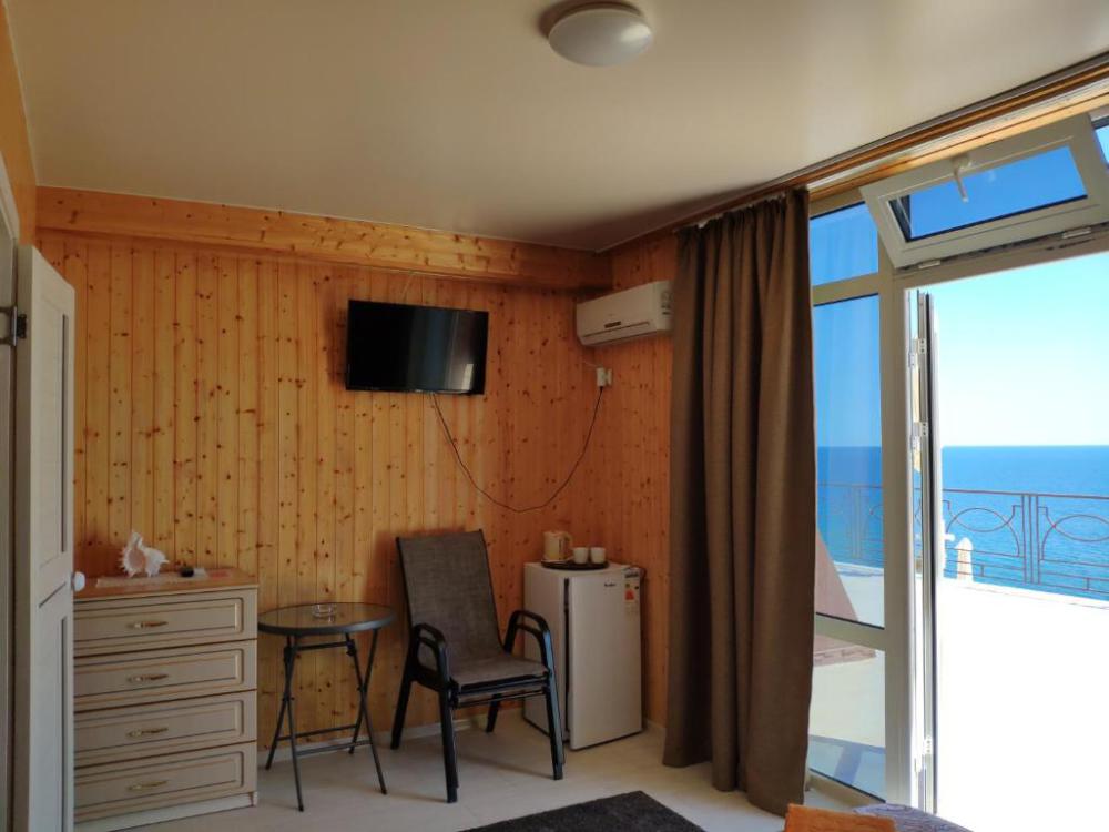 Улучшенный, с повышенной комфортностью и видом на море. В номере имеются: кондиционер, двухспальная кровать, кресло-кровать, шкаф, комод, столик, кресла, зеркало, телевизор, холодильник, электрический чайник с набором чашек, свой санузел+душ (одноразовый гель для душа, шампунь, жидкое мыло во флаконе с дозатором, туалетная бумага, большое и маленькое полотенца). Уборка номера раз в 3-4 дня, замена постельного белья - раз в пять дней.