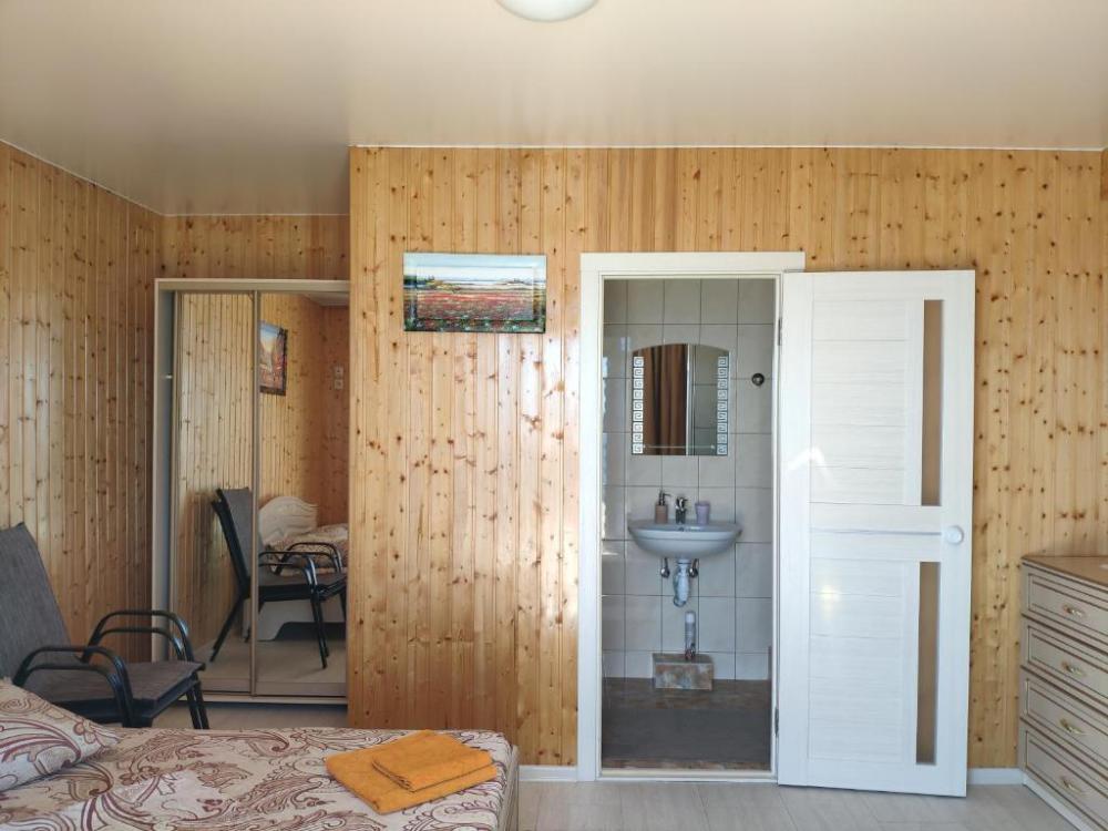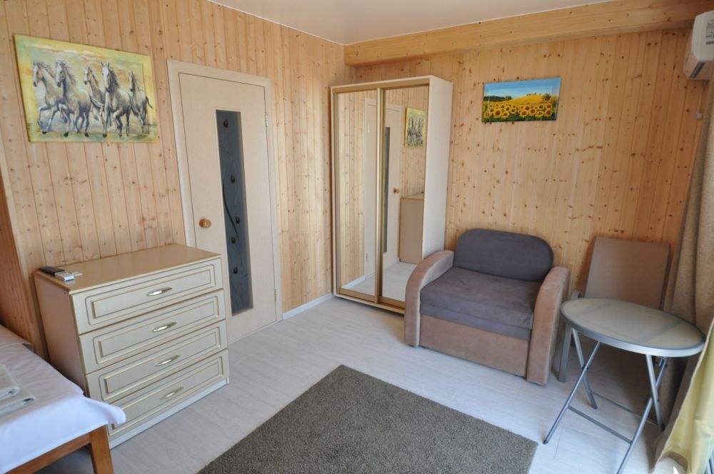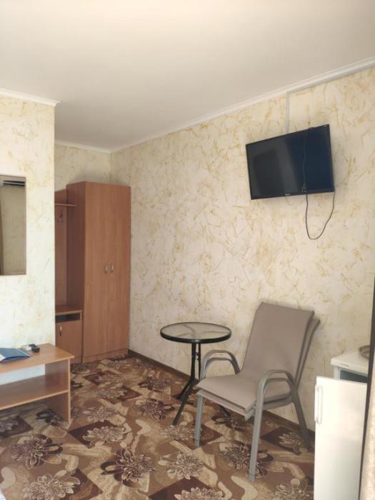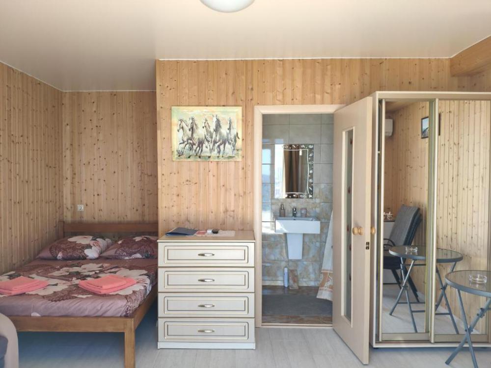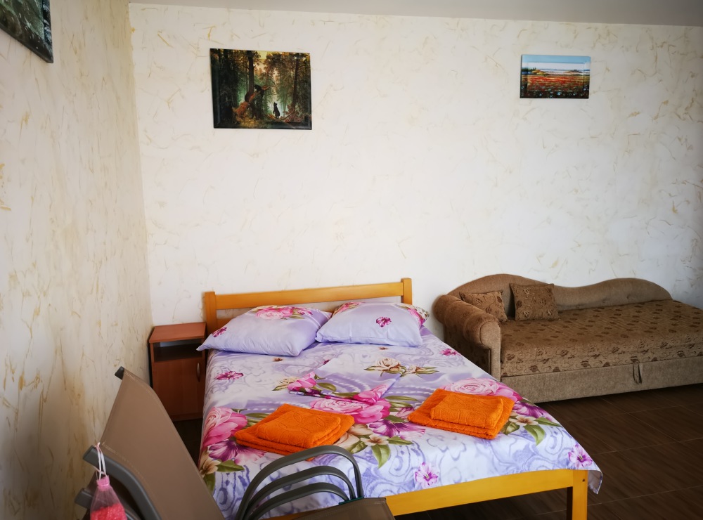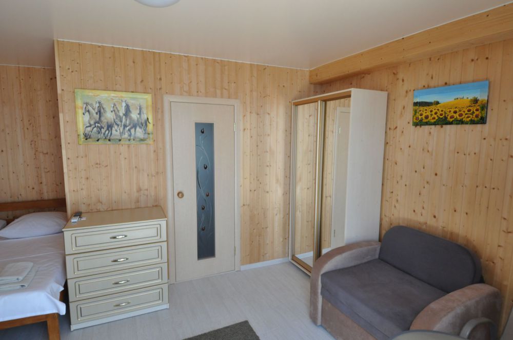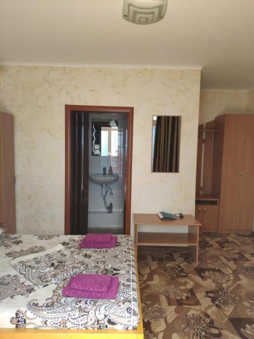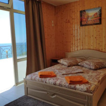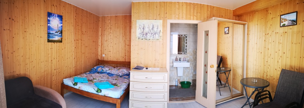 Улучшенный, с повышенной комфортностью и видом на море. В номере имеются: кондиционер, двухспальная кровать, кресло-кровать, шкаф, комод, столик, кресла, зеркало, телевизор, холодильник, электрический чайник с набором чашек, свой санузел+душ (одноразовый гель для душа, шампунь, жидкое мыло во флаконе с дозатором, туалетная бумага, большое и маленькое полотенца). Уборка номера раз в 3-4 дня, замена постельного белья - раз в пять дней.