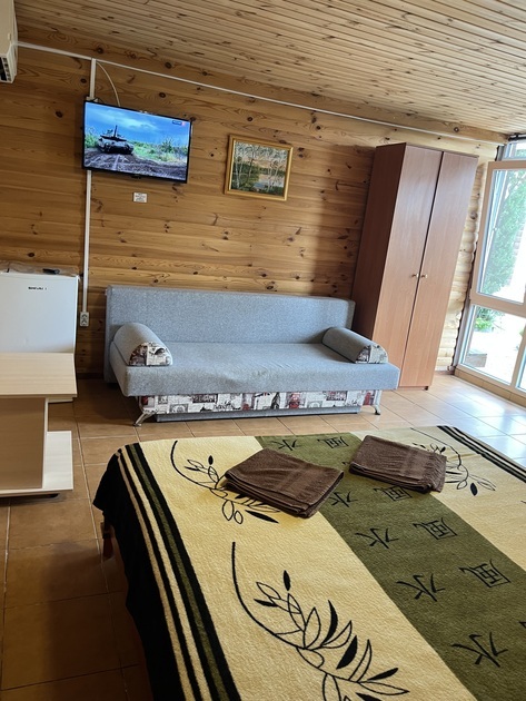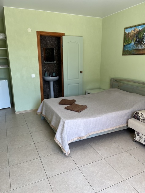 В номере двуспальная кровать и диван, сплит-система, телевизор, холодильник и санузел.