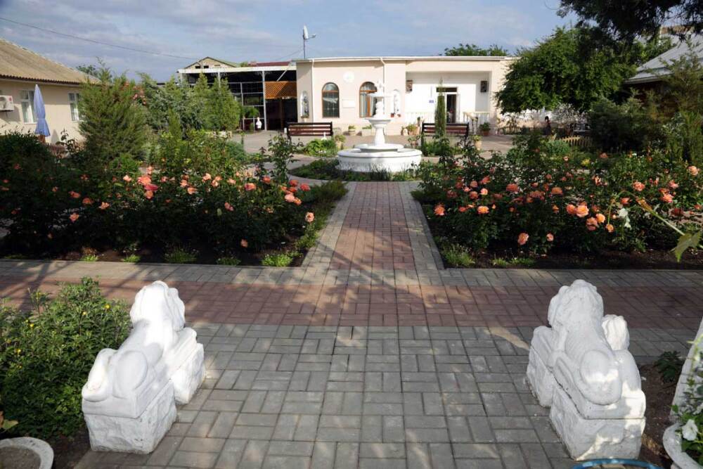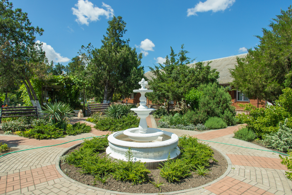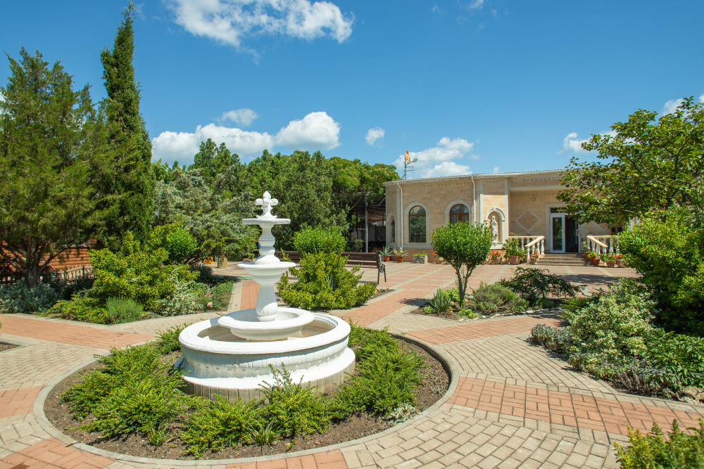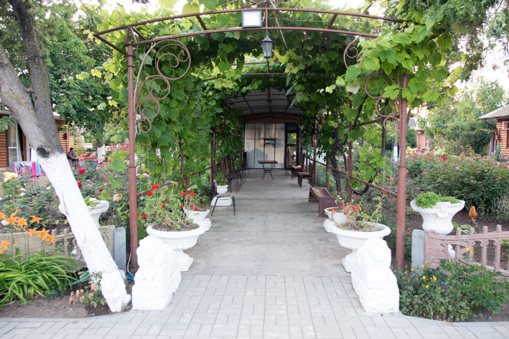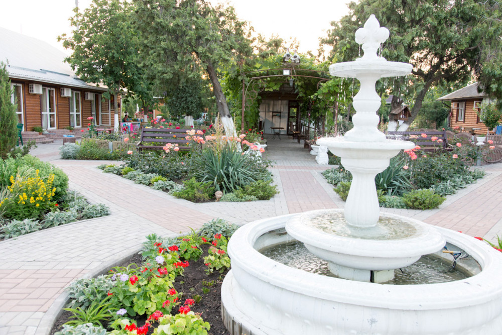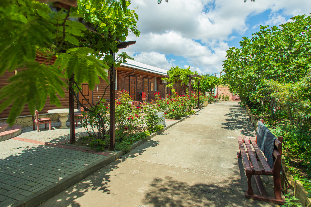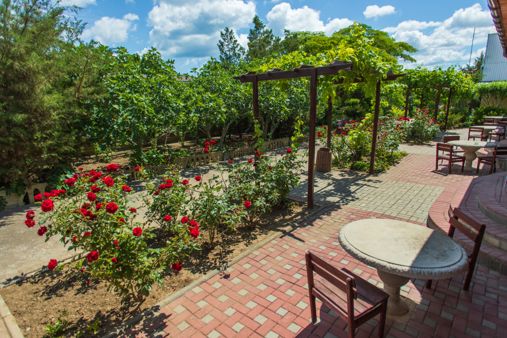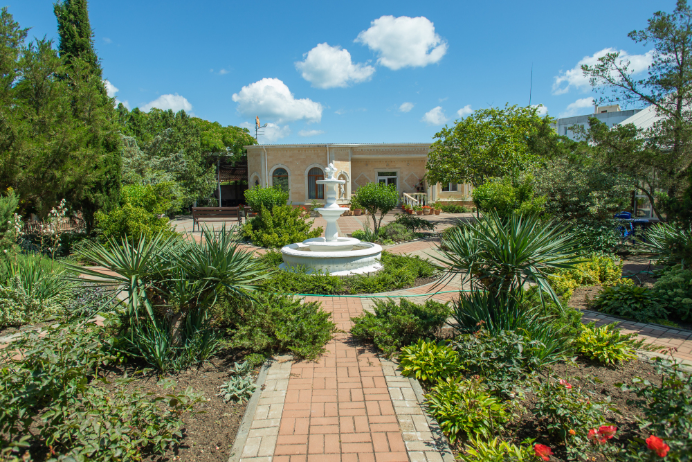 Благоустроенная территория, утопающая в зелени, впечатляющее количество и разнообразие цветов, много лавочек в тени под Крымскими можжевельниками в окружении благоухающих роз.