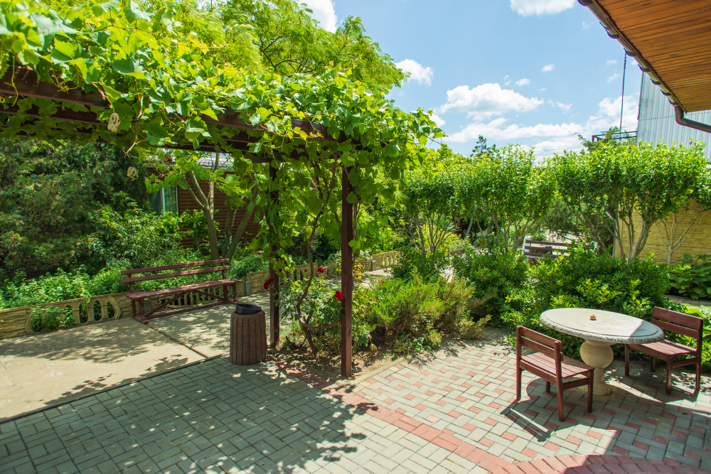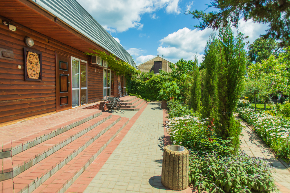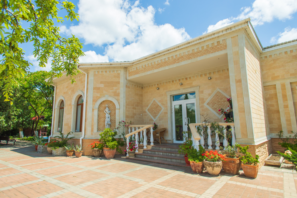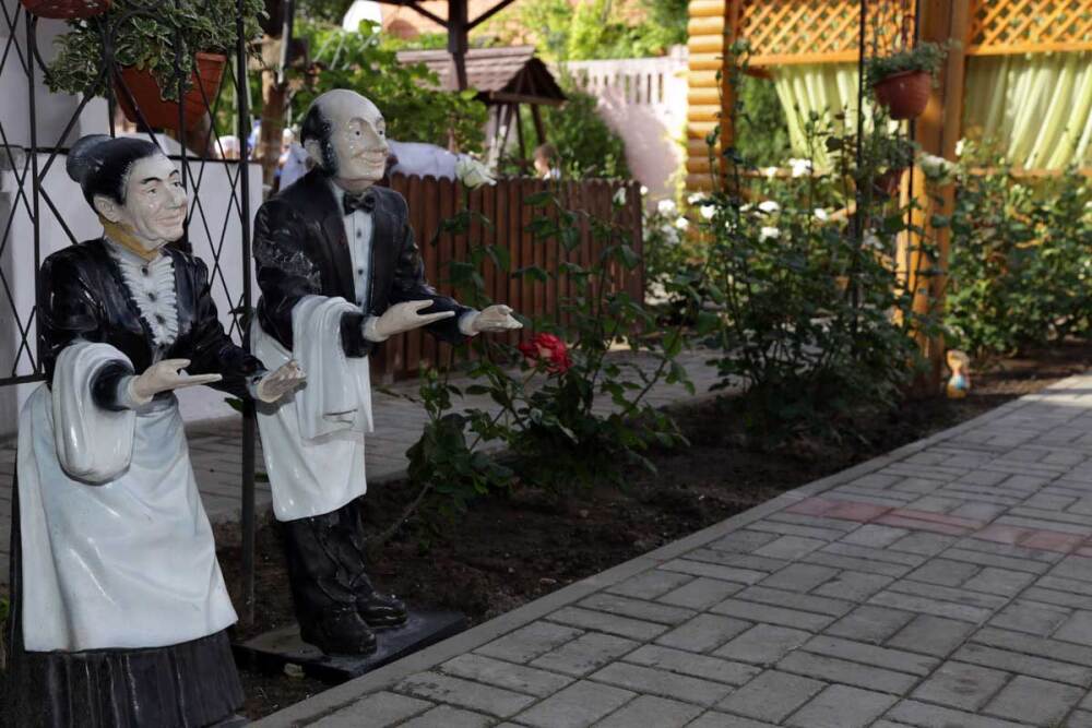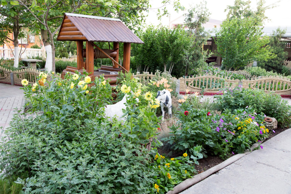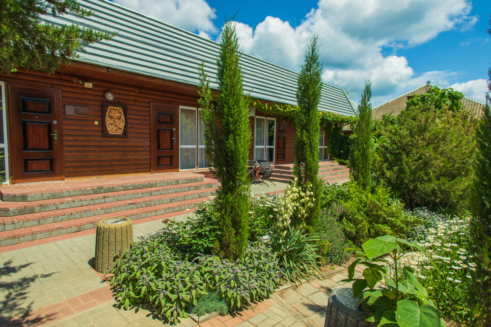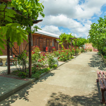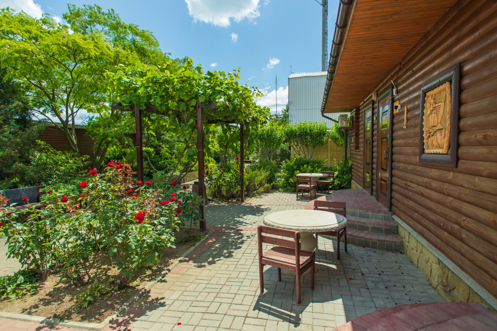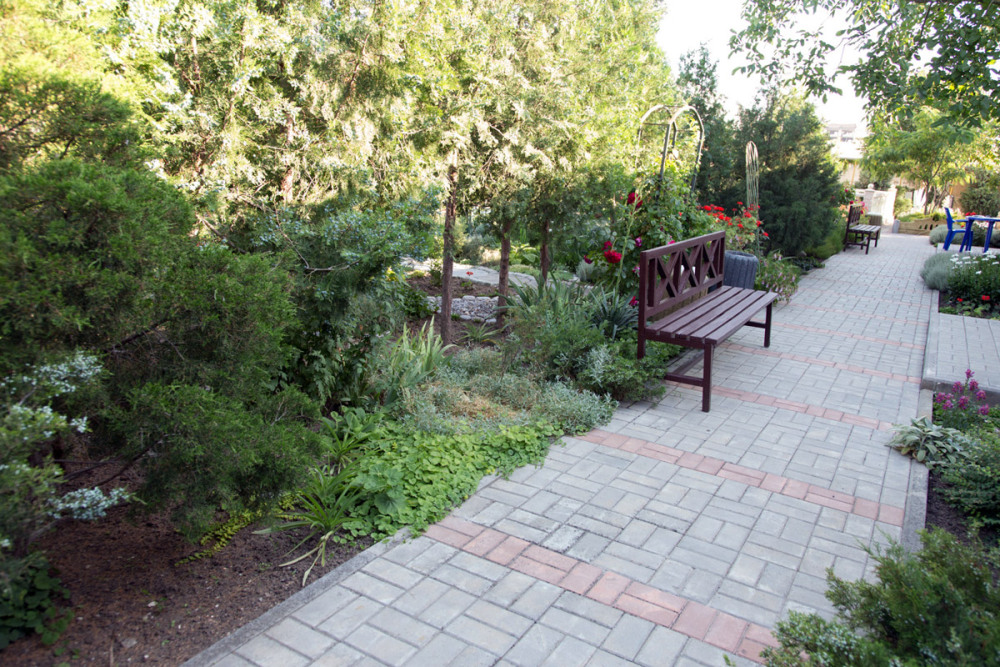 Благоустроенная территория, утопающая в зелени, впечатляющее количество и разнообразие цветов, много лавочек в тени под Крымскими можжевельниками в окружении благоухающих роз.