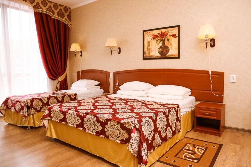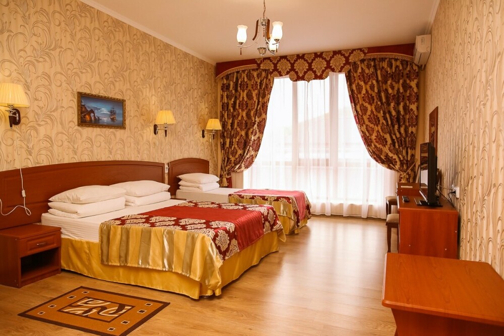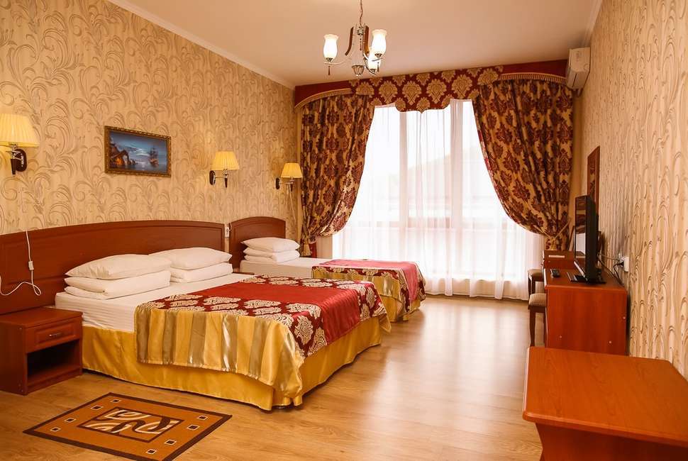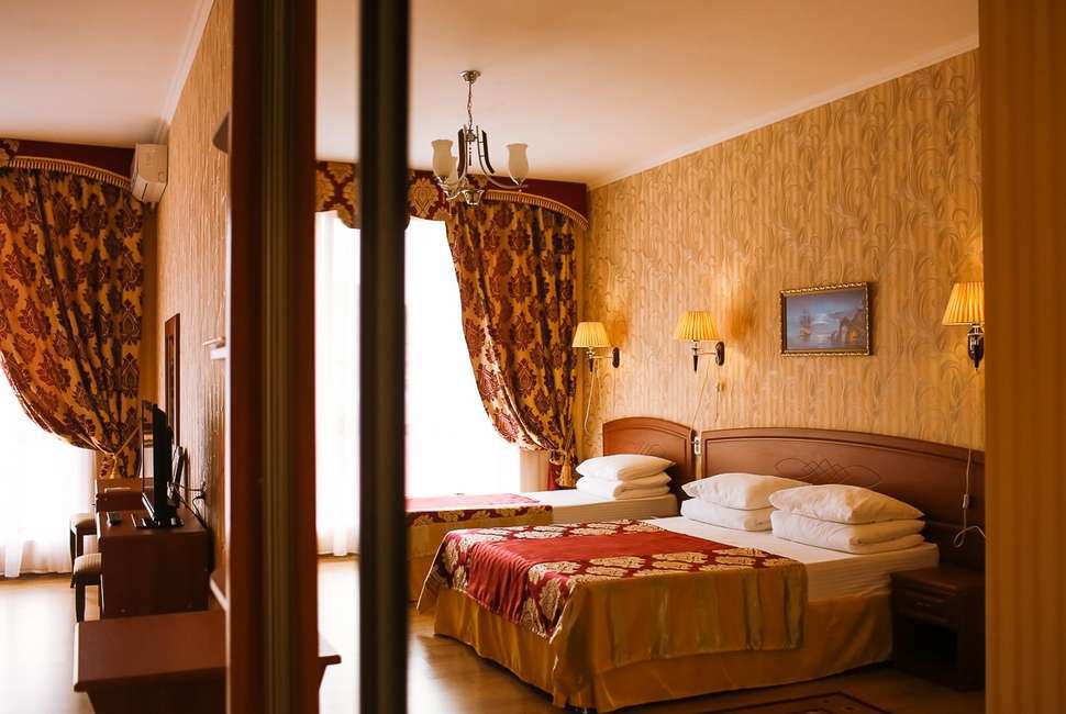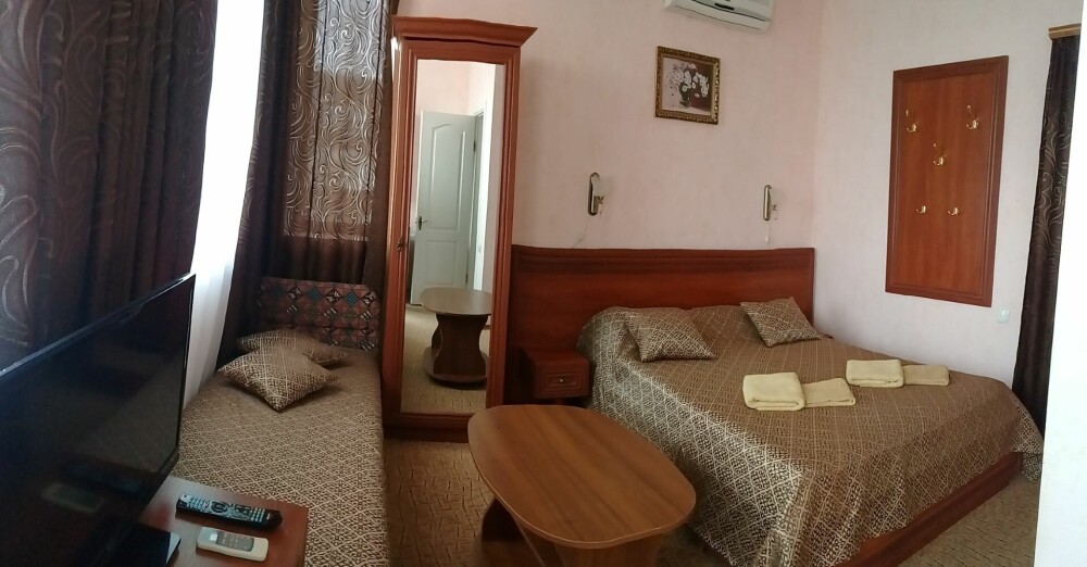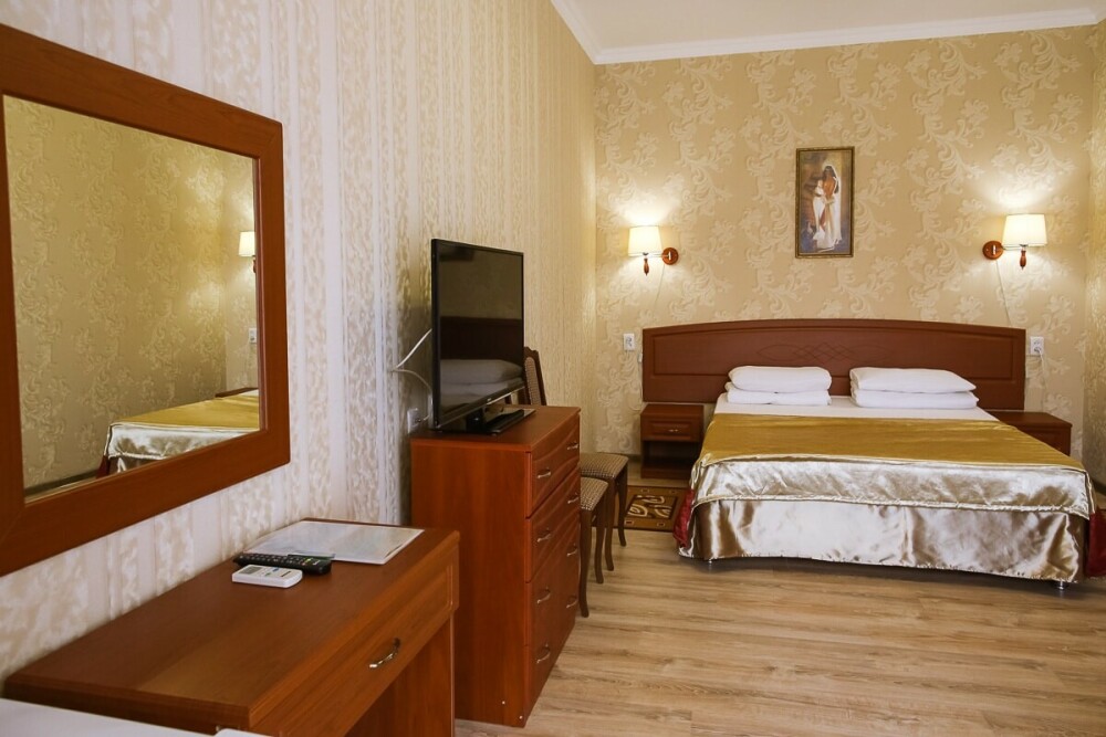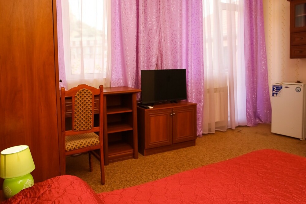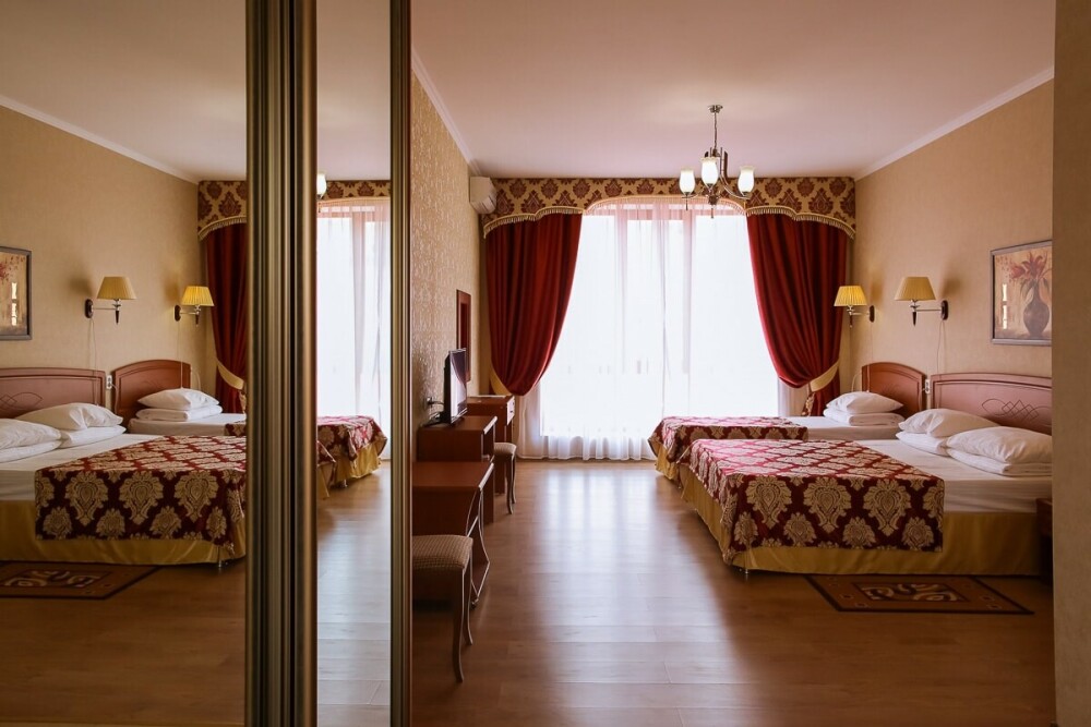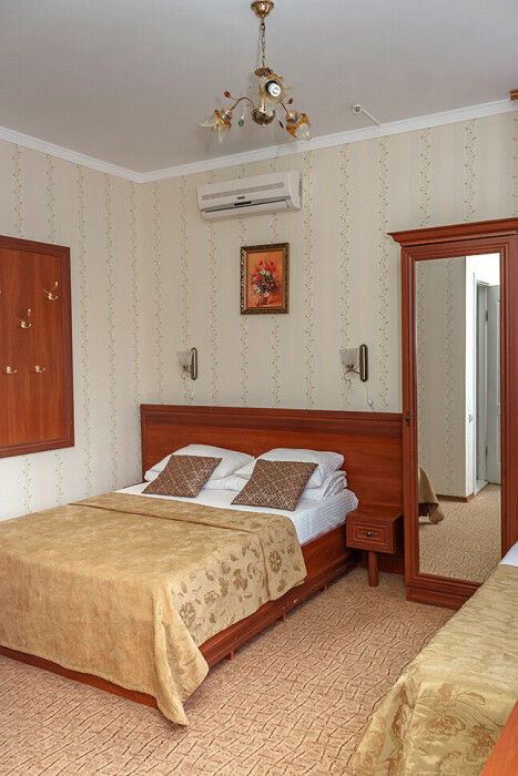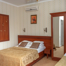 В нашем номерном фонде представлены: стандартные номера (2-3-местные), двухкомнатный номер на 4-5 человек, номера Полулюкс (2-3-местные) и Люкс (2-3-местные). В каждом номере есть все необходимое для комфортного проживания: современная мебель, телевизор со спутниковым ТВ, кондиционер, холодильник, отдельный санузел.
