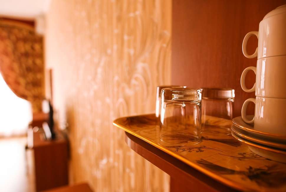 В номере есть чайник и минимальный набор посуды.