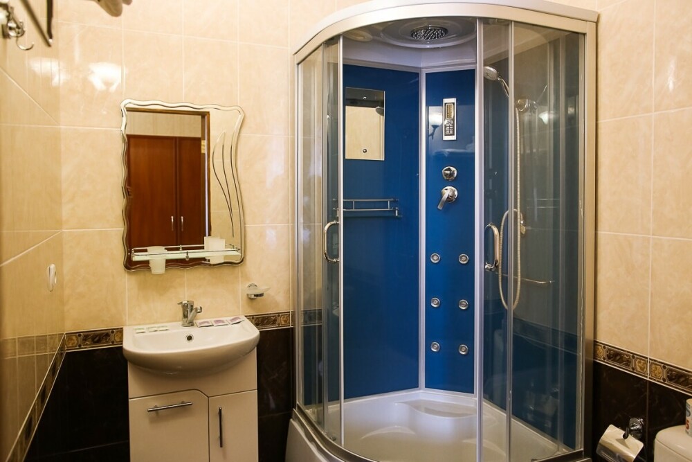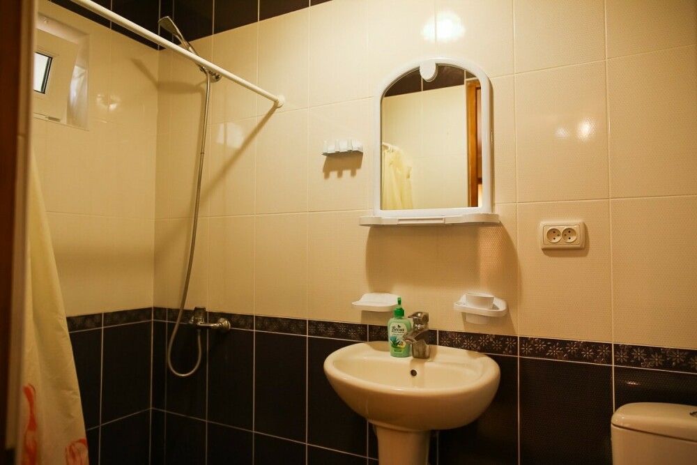 В каждом номере: санузел с умывальником, душем и унитазом. В номере есть чайник, минимальный набор посуды, фен.