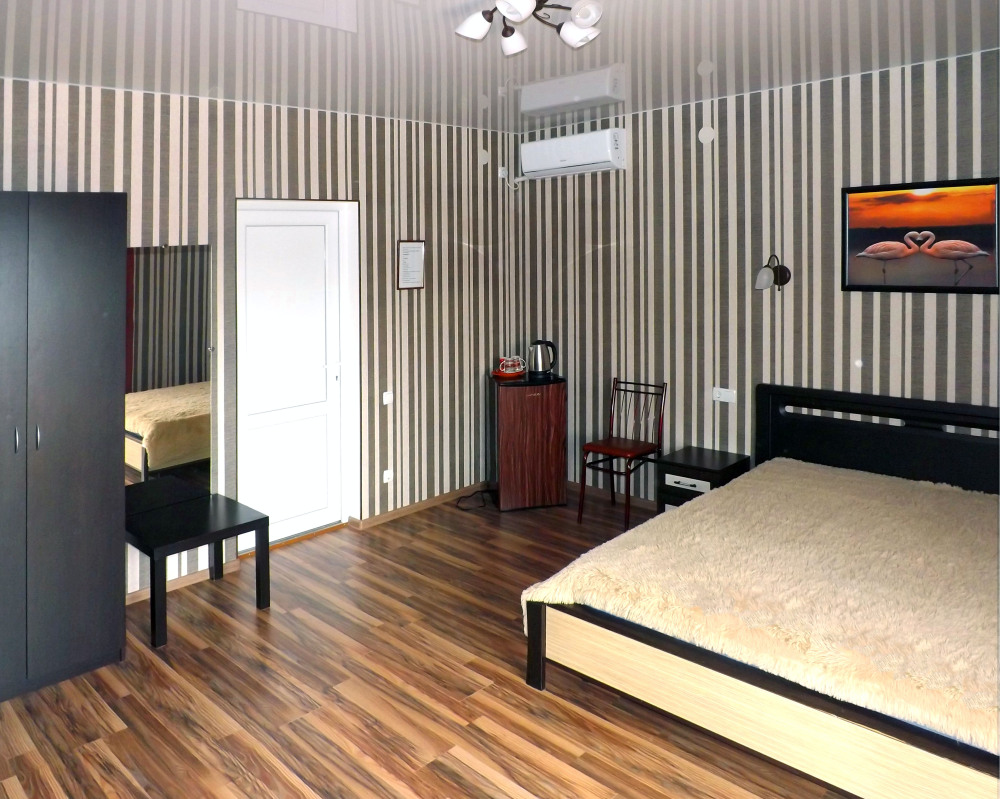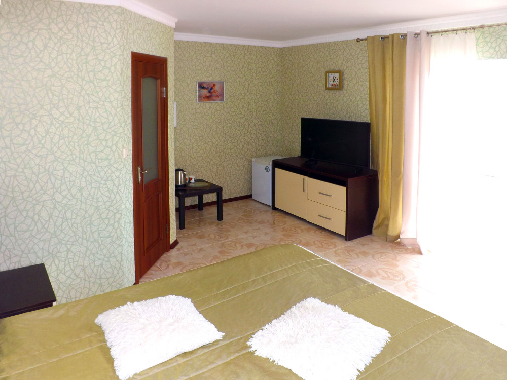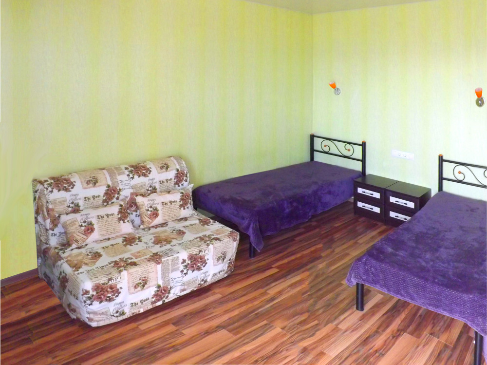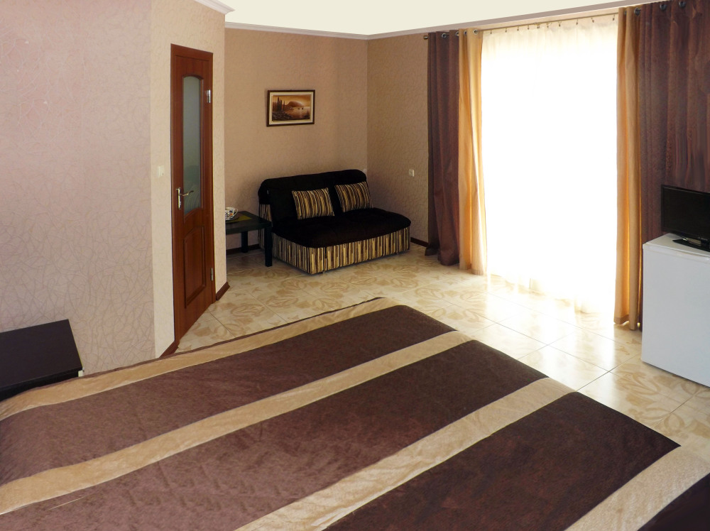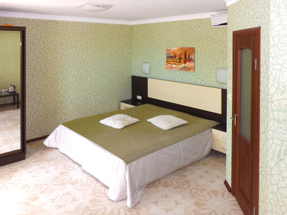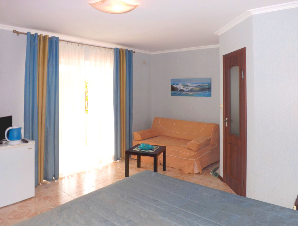 В номере две большие комнаты (в первой комнате двухспальная кровать, во второй две раздельные кровати и раскладной 1.5 спальный диван-кровать), индивидуальный большой балкон (из каждой комнаты есть выход на балкон), расположен на 3-м этаже Виллы Васалия. Панорамный вид на море. Удобства: санузел(фен в санузле), комплект полотенец, мини-холодильник, кондиционер(в комнате с двухспальной кроватью), цифровое TV, чайник, зона отдыха на балконе(стол+стулья). Есть возможность воспользоваться микроволновой печью, плитой, стиральной машиной и утюгом. Стоимость за размещение 5-ти гостей.