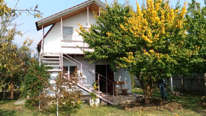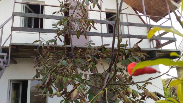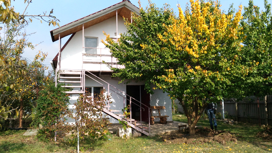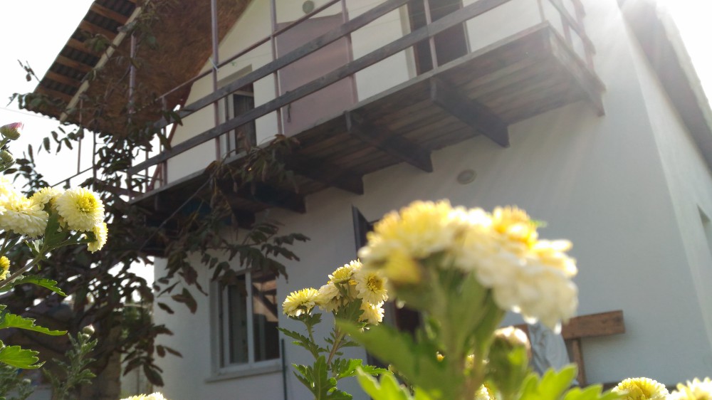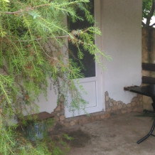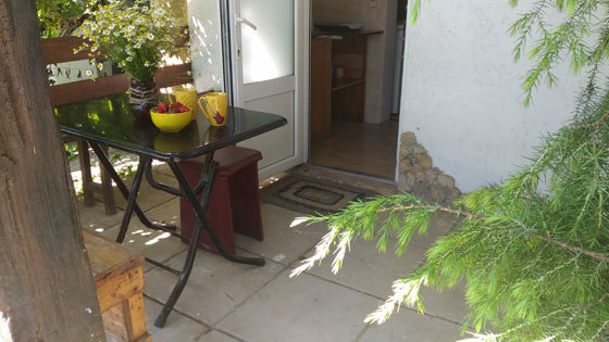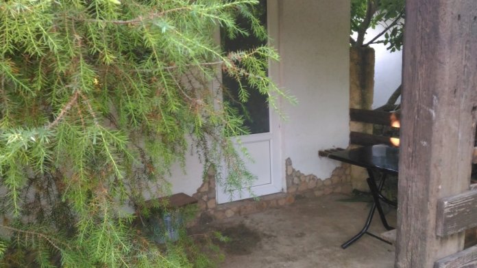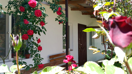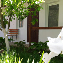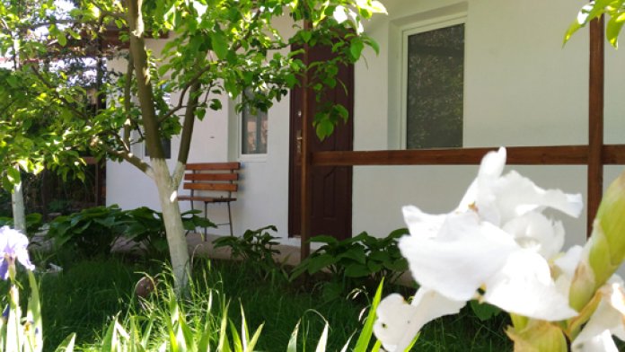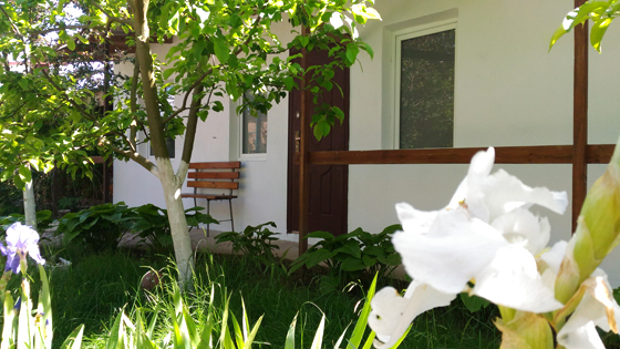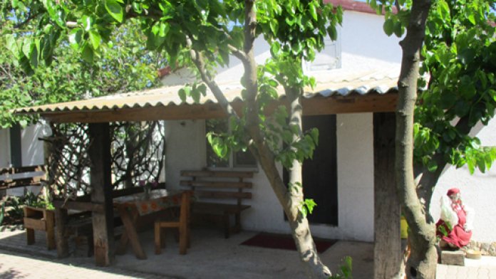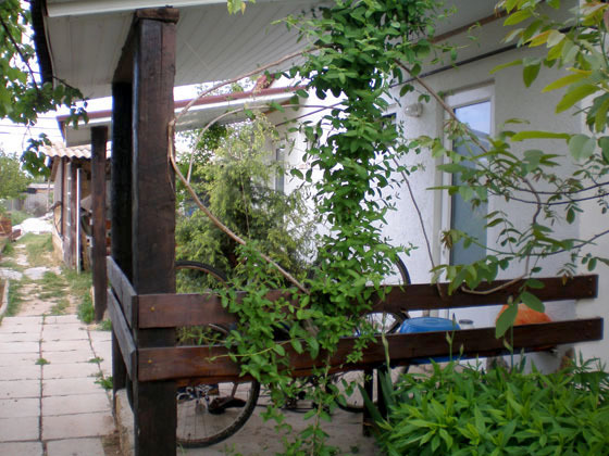 2 раздельные спальные комнаты, санузел в каждой комнате, прихожая-кухня, веранда перед домом оплетена виноградом и вьющимися растениями.