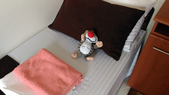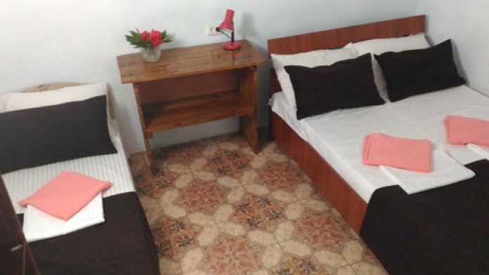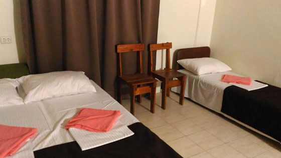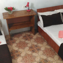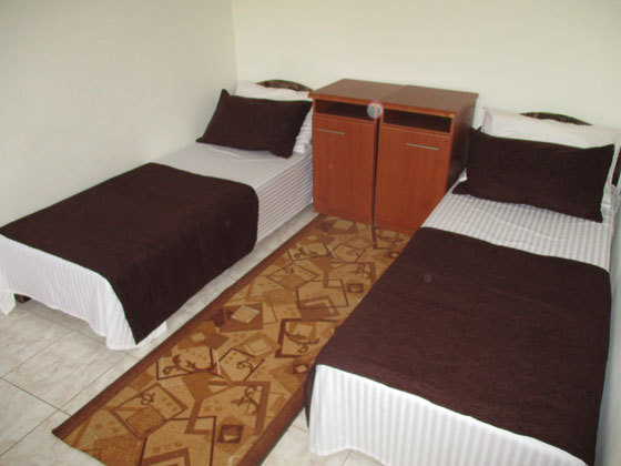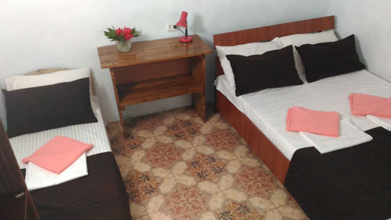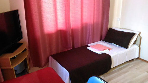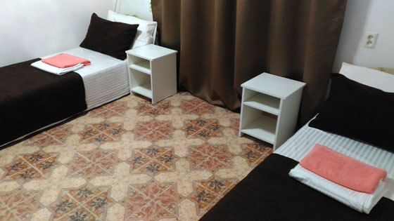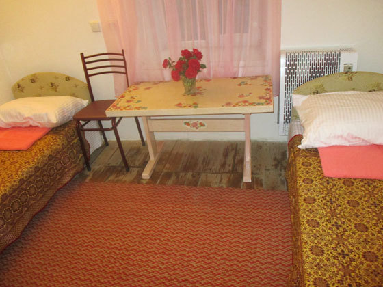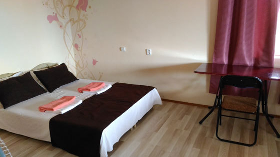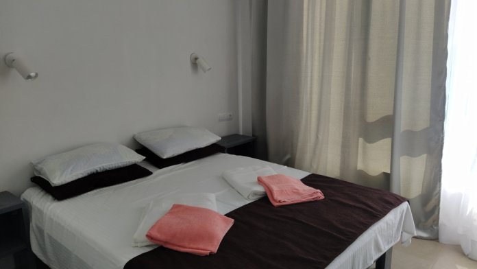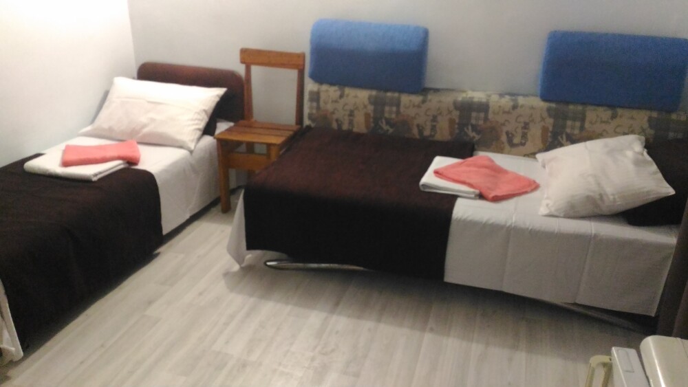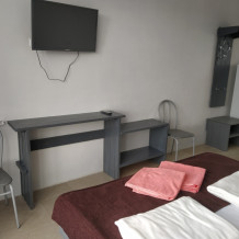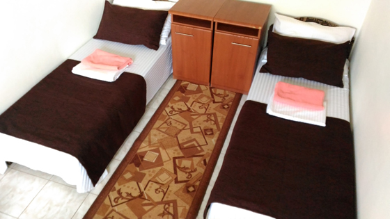 В номере односпальные и двуспальные кровати, уголок-прихожая, тумбочки, стол, стулья.