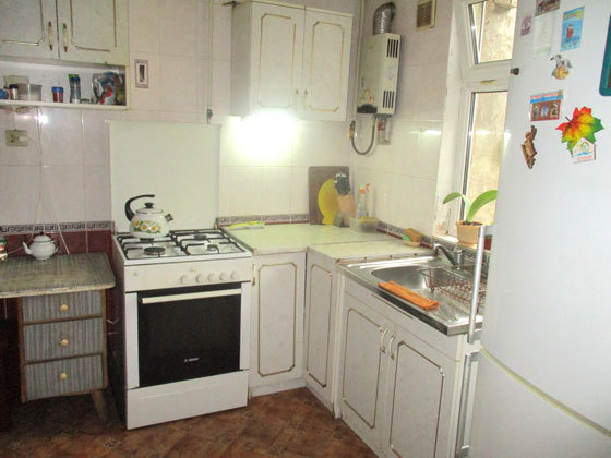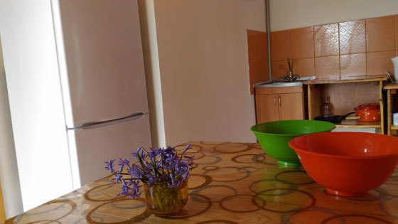 Кухня - двухкамерный холодильник, инверторная плита, набор необходимой посуды, стол, табуретки.