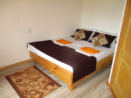 2 этаж: Комната - двуспальная кровать, односпальная кровать, вешалка, тумбочки, стол, стулья.