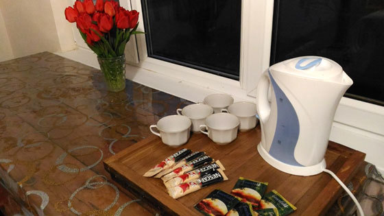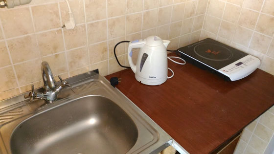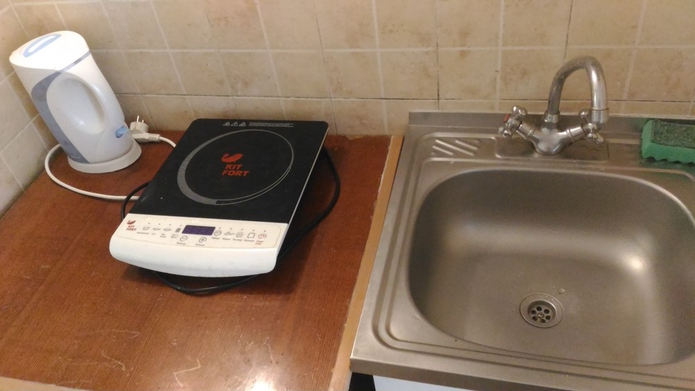 Кухня (электро-чайник, плитка, мойка, набор необходимой посуды).