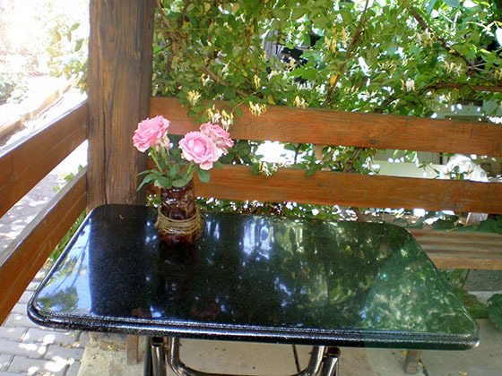 На веранде: деревянный стол, лавки.