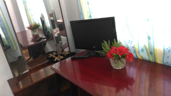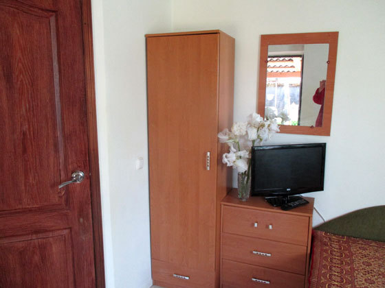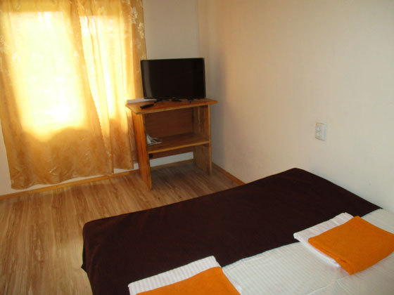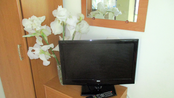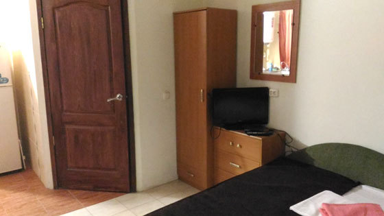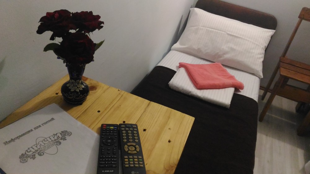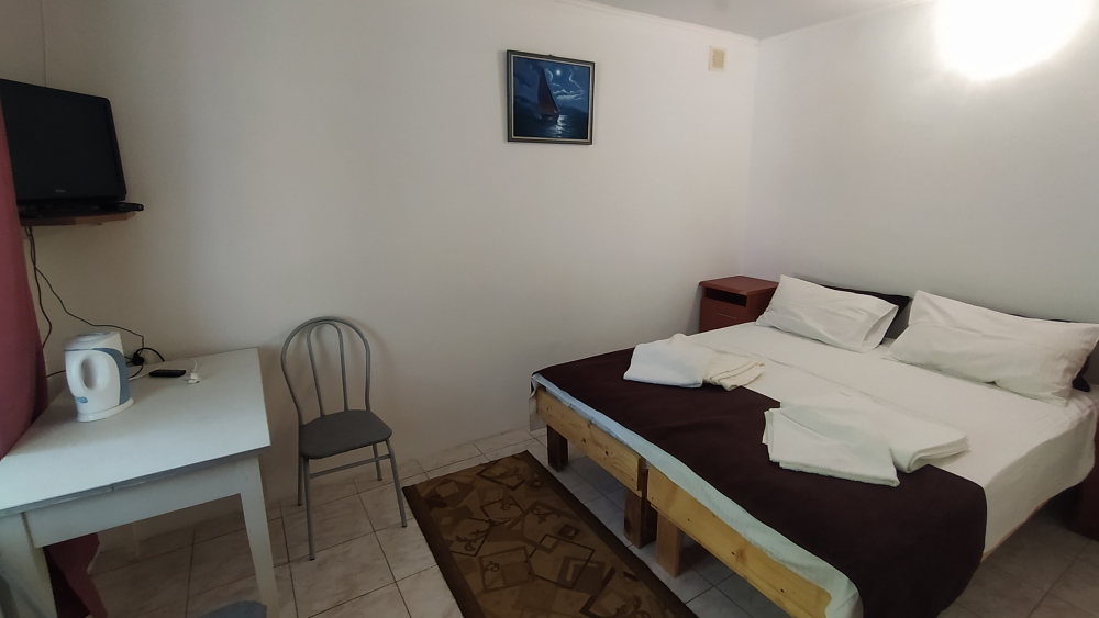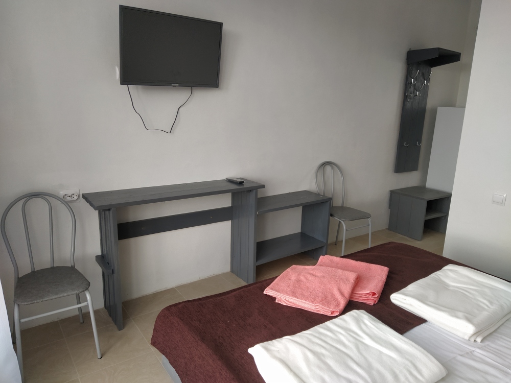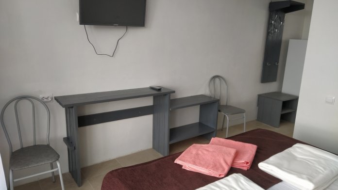 В номере двуспальная кровать, односпальная кровать, шкаф, тумбочка, стол, стулья, трюмо, телевизор.