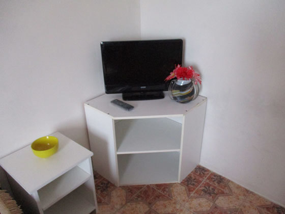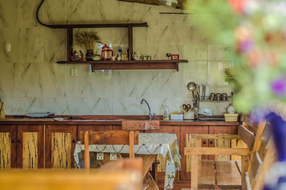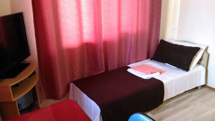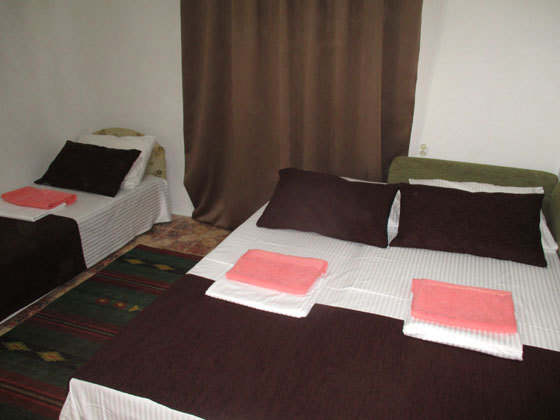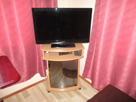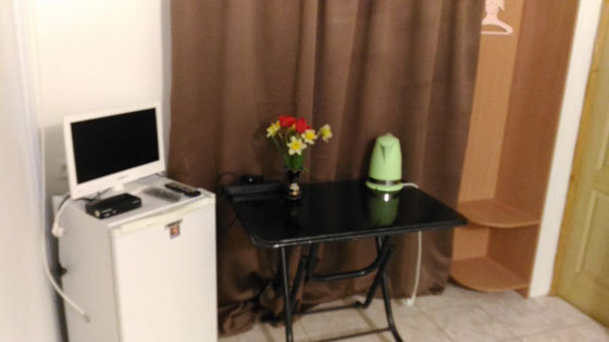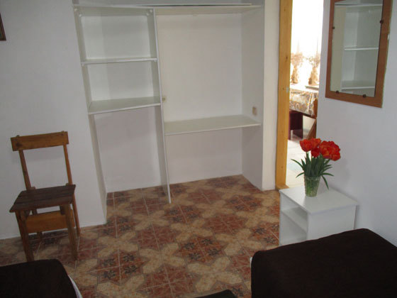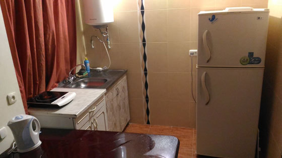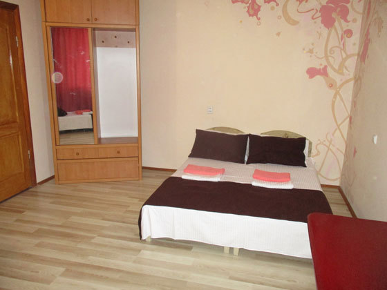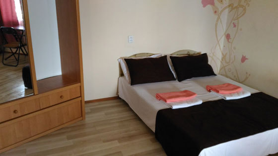 В номере двуспальный диван, односпальная кровать, шкаф, комод, стол, стулья, кухня (плитка, мойка, набор необходимой посуды).