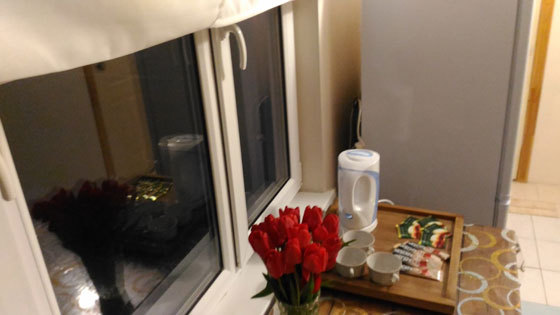 Кухня в прихожей (большой двухкамерный холодильник, инверторная плита, электрочайник, набор необходимой посуды).