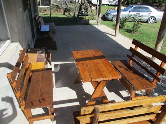На веранде: деревянные столы, лавки, качели.