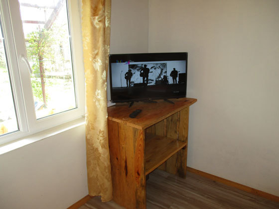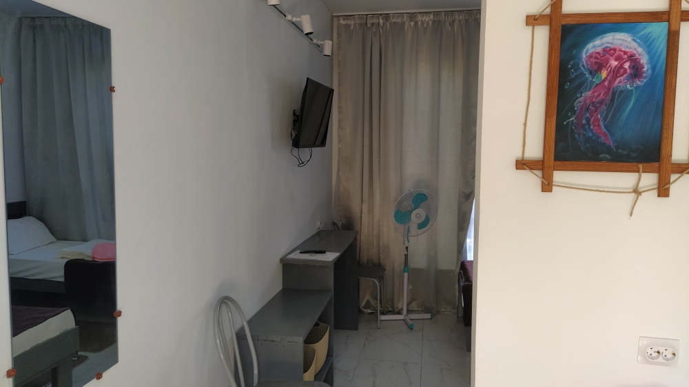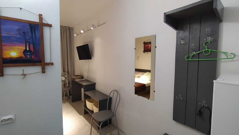 1 этаж: Комната - двуспальная кровать, вешалка,тумбочка, телевизор, санузел.