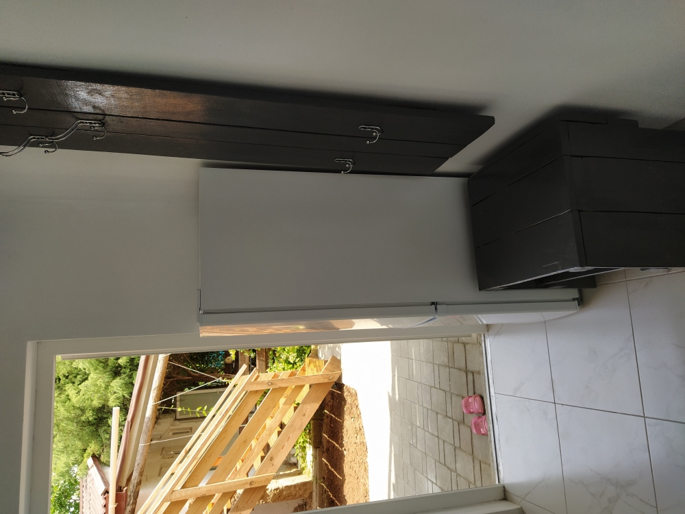 На веранде: холодильник, деревянный стол, лавка.