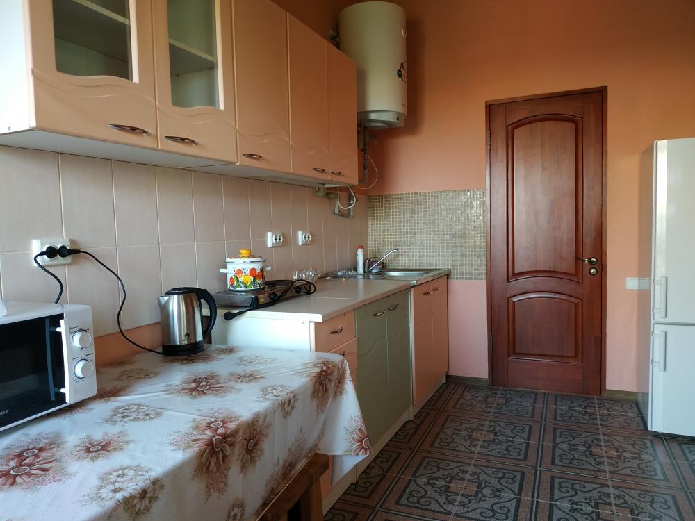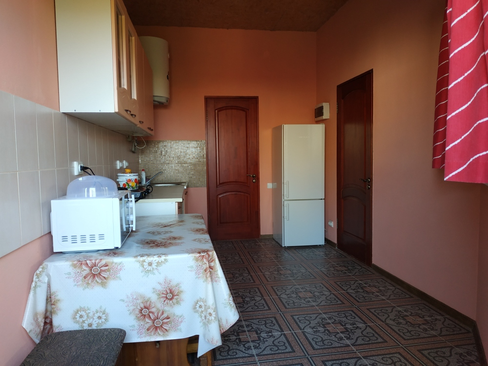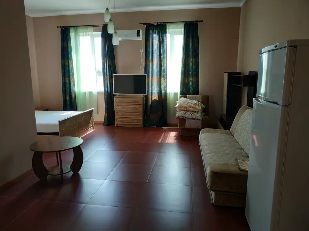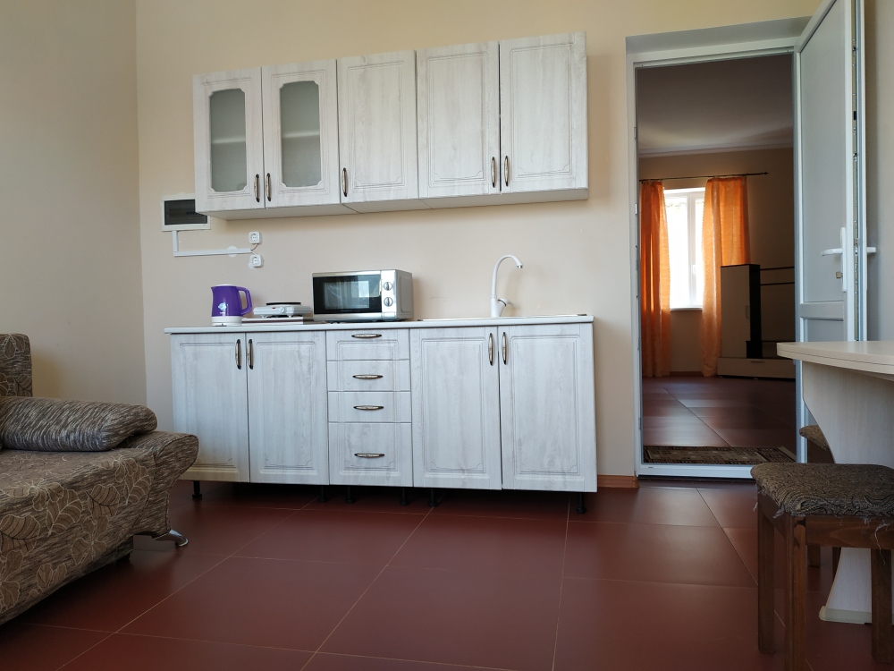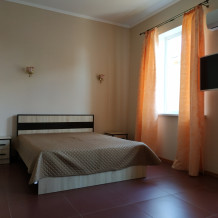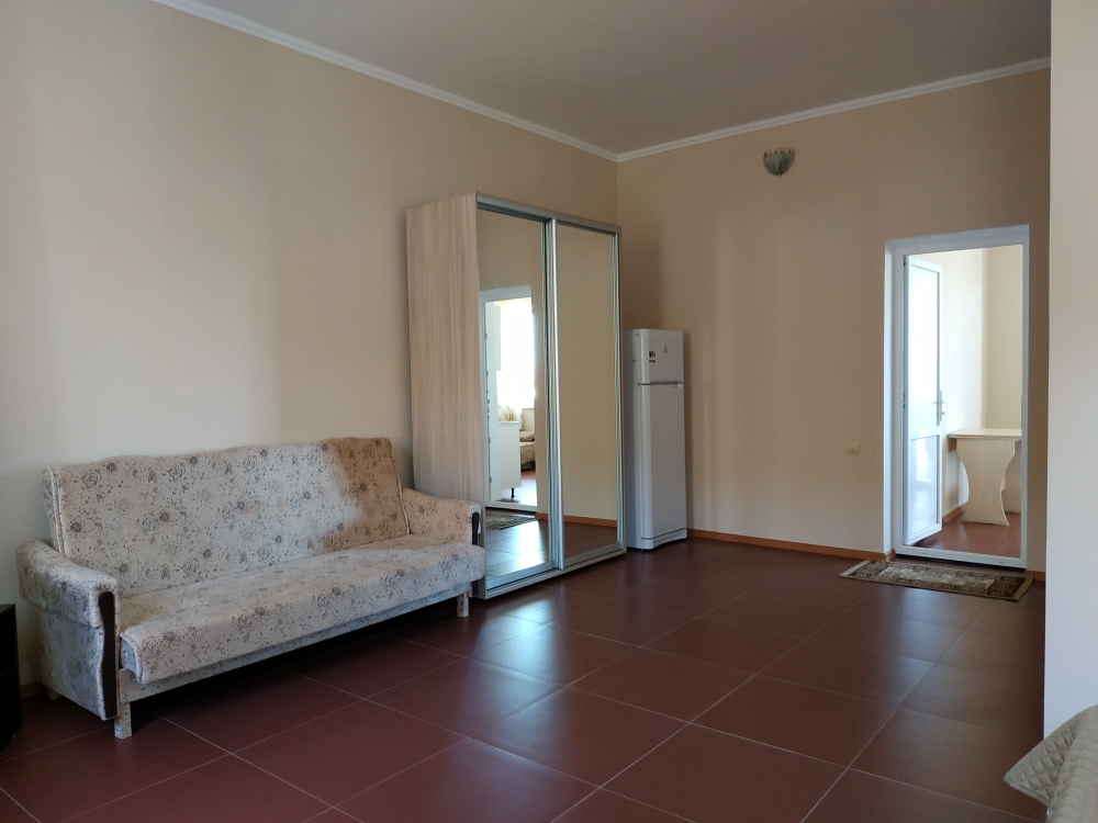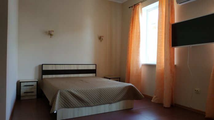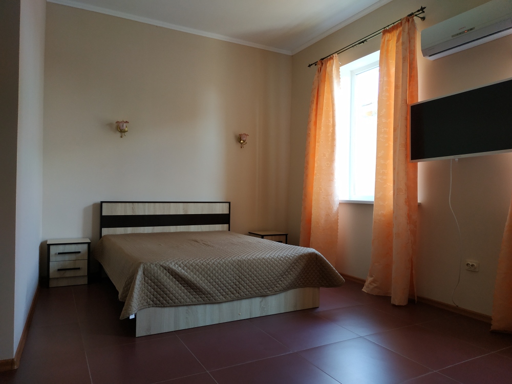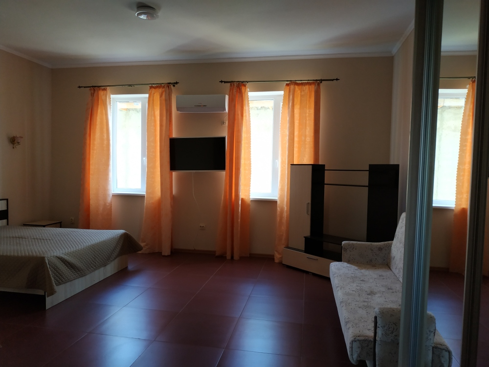 На 2 этаже - двухкомнатные Люксы с видом на море с общего балкона. У каждого Люкса - своя мини-кухня с электрическим чайником и микроволновкой. Люкс рассчитан на 6 человек (2 двуспальные кровати, большой диван на 2 места), журнальный стол, двухкамерный холодильник, кондиционер, в санузле - полноценная ванна, свой бойлер для круглосуточного подогрева воды на 100 л. В спальне - туалетный стол, платяной шкаф, спутниковое ТВ.