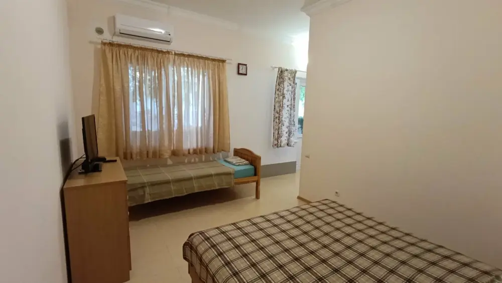 В номере: одна двуспальная и одна односпальная кровати (170 см), телевизор, вентилятор, двухкамерный холодильник, обеденная зона на веранде со столом и стульями. Удобства в номере с душем и индивидуальным бойлером.