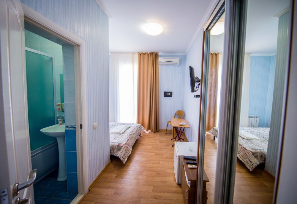 Номер на 2 этаже с балконом, на 1 этаже без балкона (сушилка для белья за окном ). Ежедневная влажная уборка номера производится с применением дезинфицирующего средства «DESO», включает дезинфекцию всех контактных поверхностей (пульт управления от телевизора и кондиционера, дверные ручки, стирку наматрасников, обработка тканевых поверхностей парогенератором), проветривание номера и обеззараживание воздуха рециркулятором.