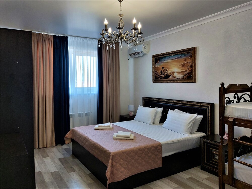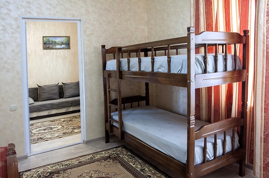 Основные места - двуспальная кровать (160/180*200 см) + двуспальный диван, дополнительное место - двухъярусная кровать.