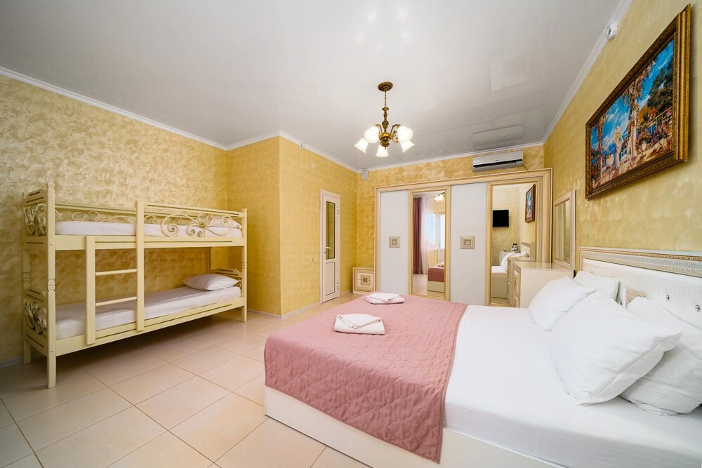 Основное место - двуспальная кровать (160/180*200 см) + двуспальный диван. Дополнительное место - двухъярусная кровать.