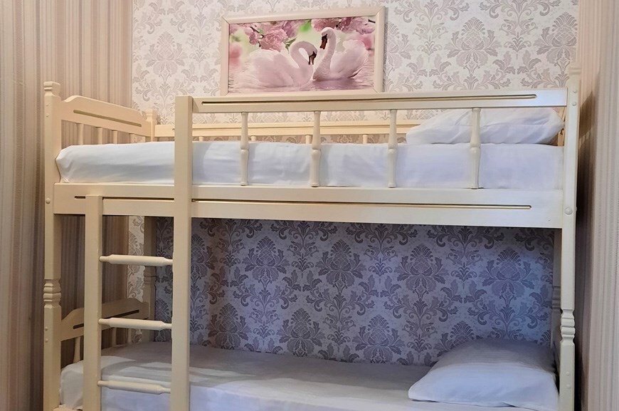 Основное место - двуспальная кровать (160 или 180*200 см), дополнительным местом может быть либо двуспальный диван, либо двухъярусная кровать.