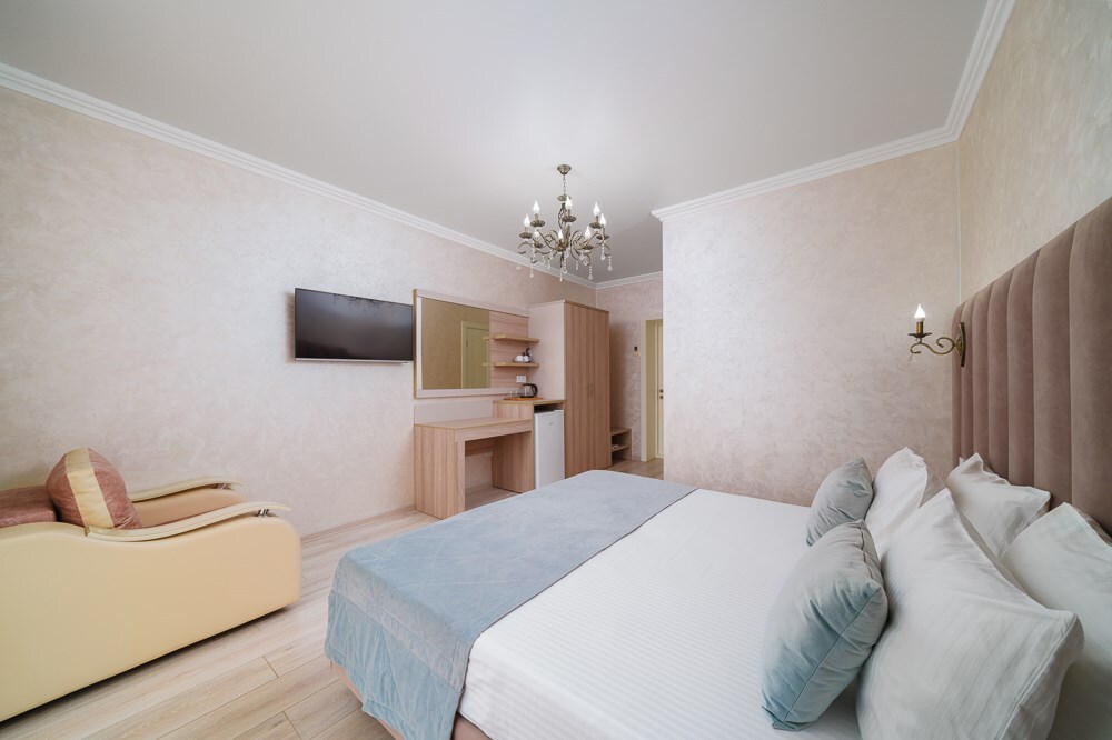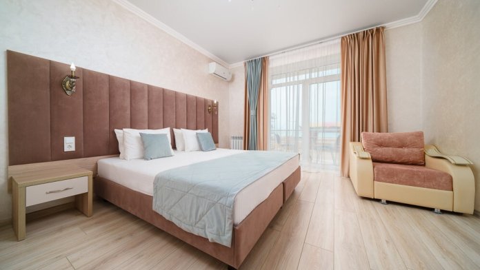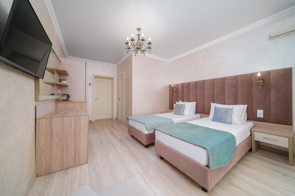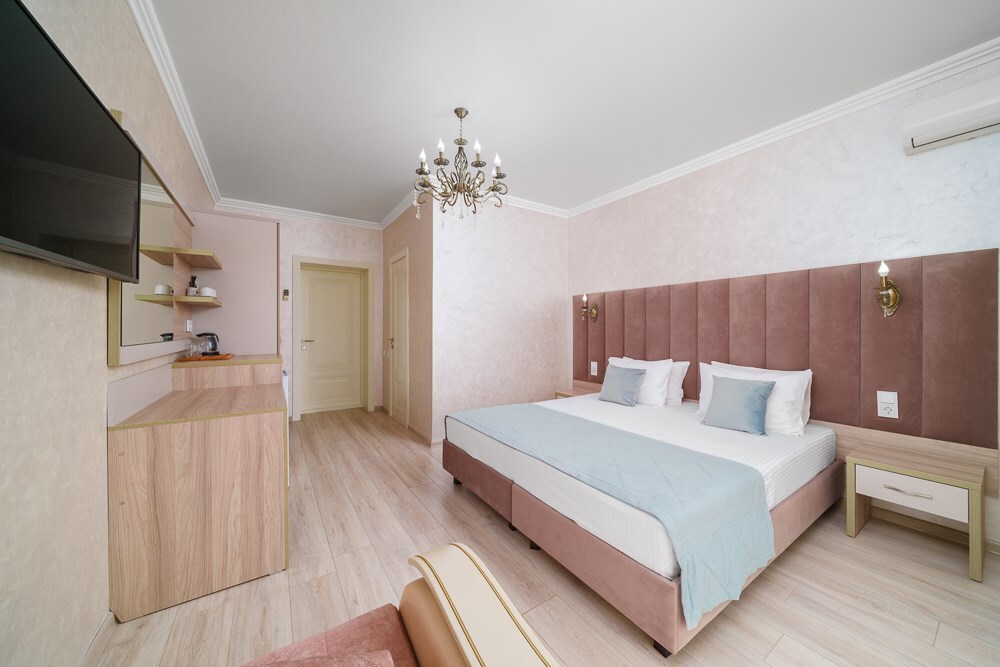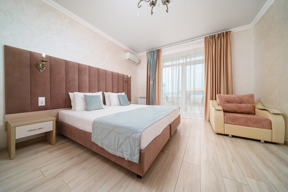 Номер данной категории расположен на 2 этаже в “Основном” корпусе, ближайшем к пляжу. Корпус сертифицирован по категории 3 звезды. В номере этой категории имеется балкон с видом на пляж и море.