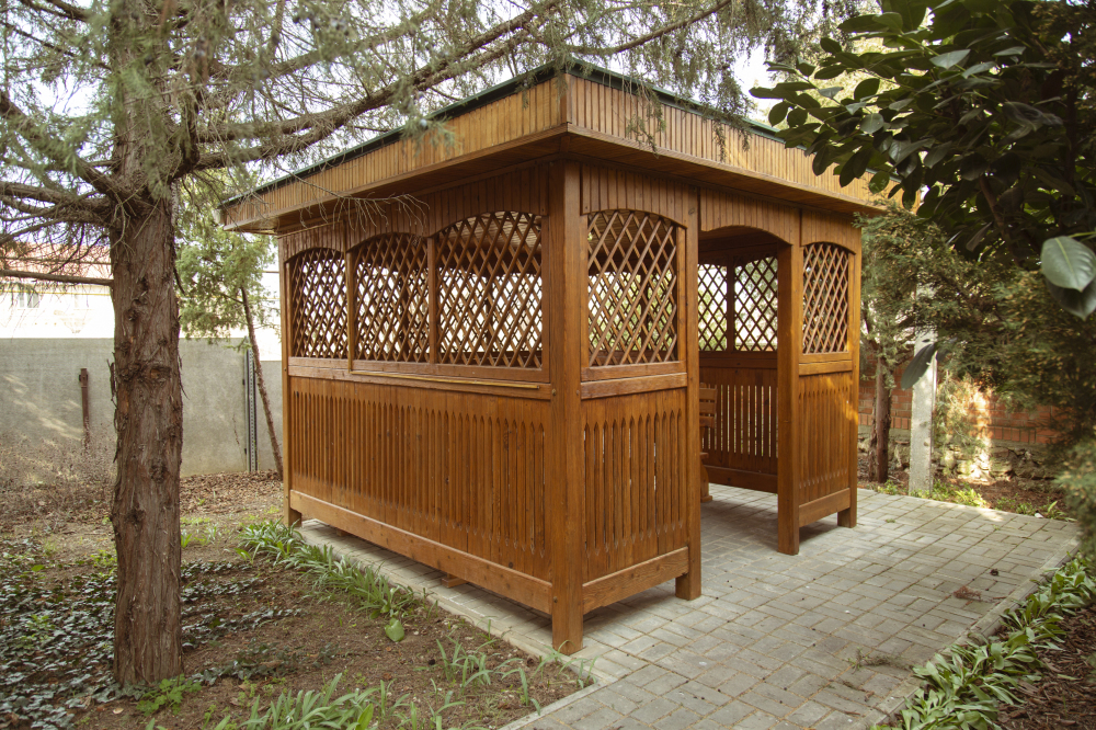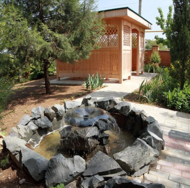• красивый двор со своей парковкой, беседкой, фонтаном, газоном.