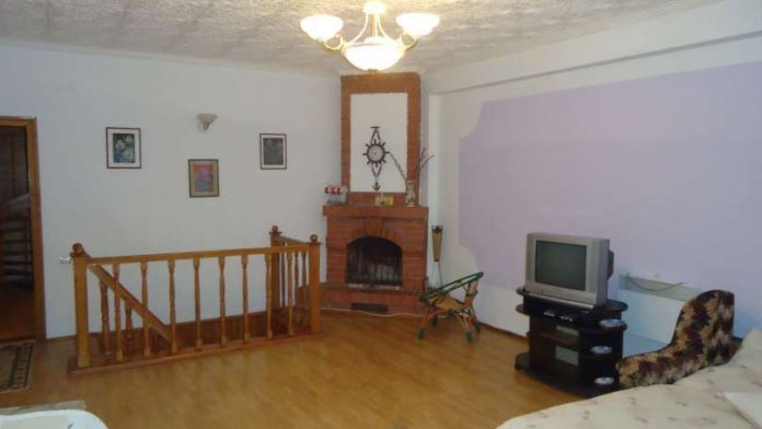 Второй этаж: гостиная - гостиная-каминный зал с диваном, креслами, столом, телевизором, кухня