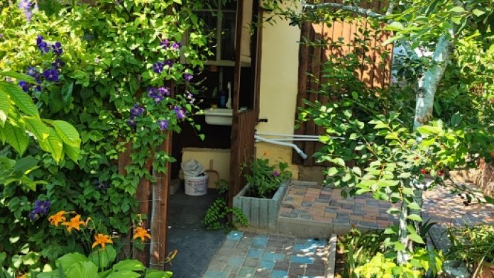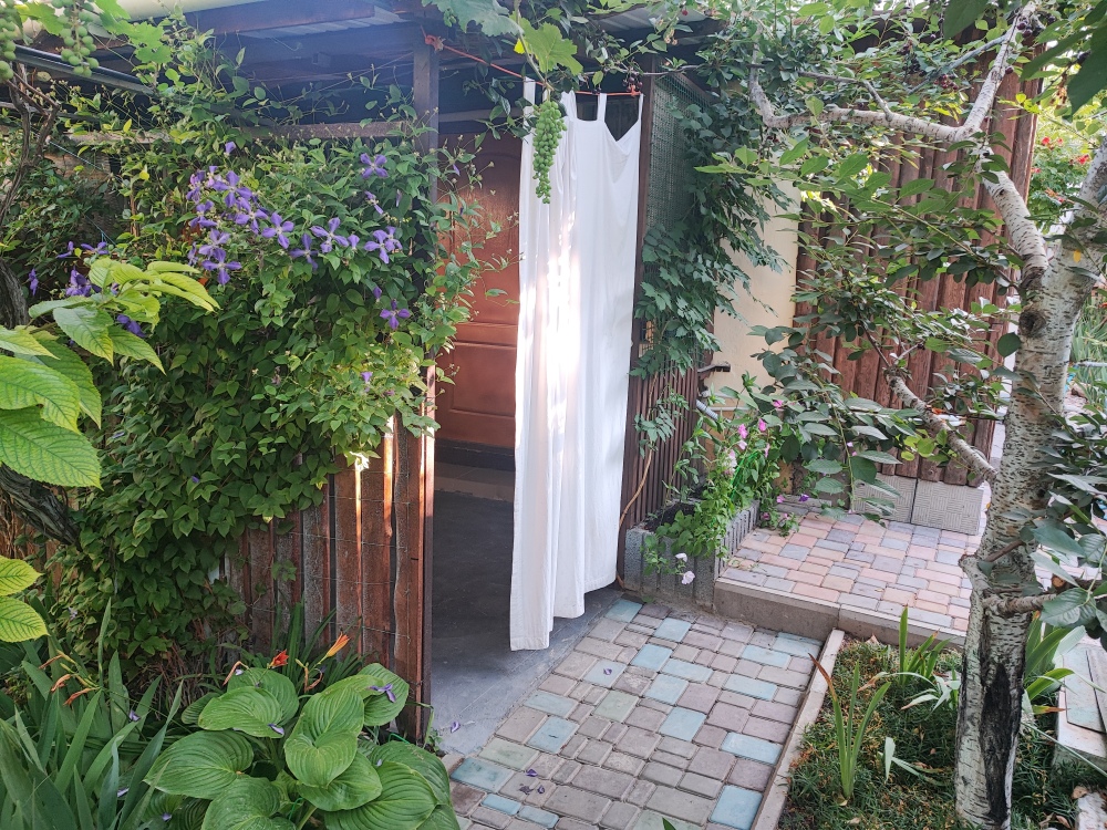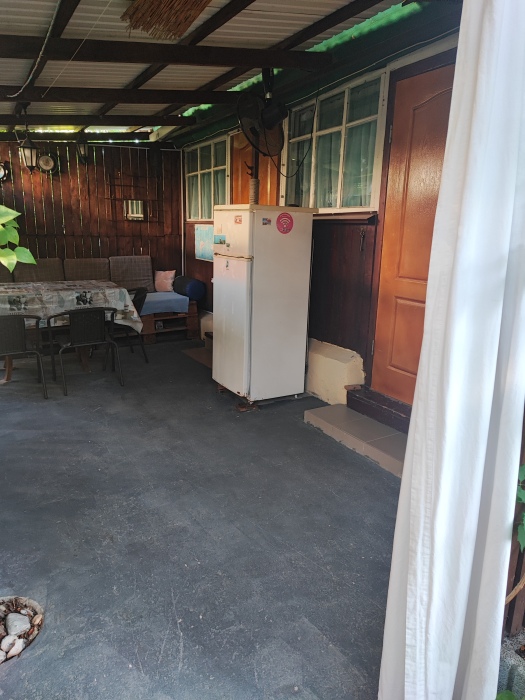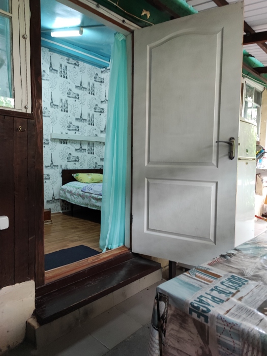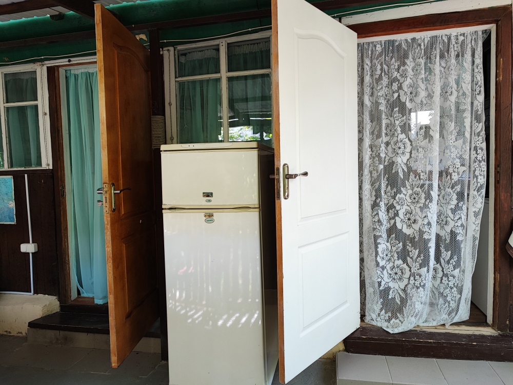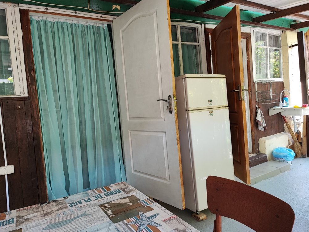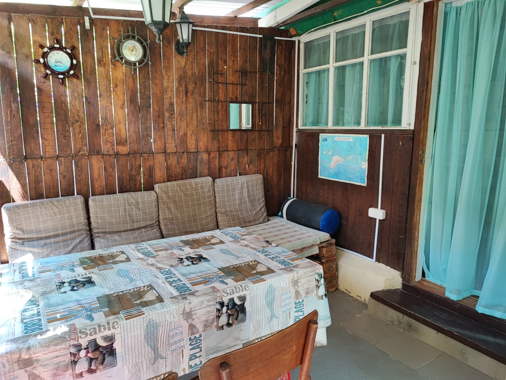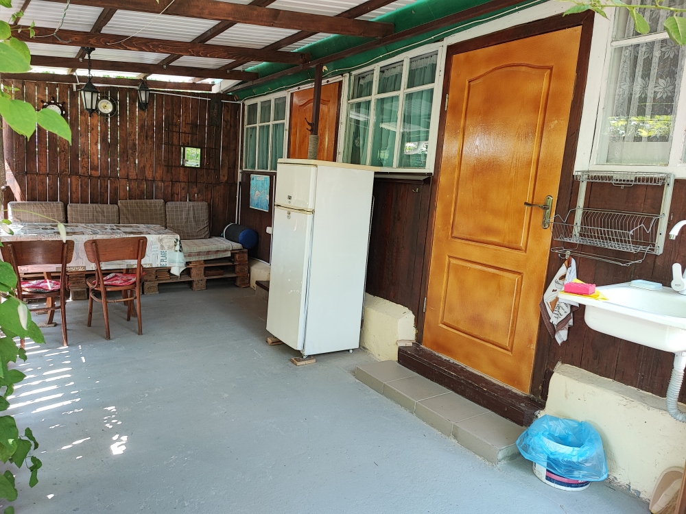 Пол дома из 2 раздельных комнат,которые объединяются между собой большой верандой на свежем воздухе,на которой организована обеденная зона,стоит холодильник,мойка для мытья посуды с горячей водой.
