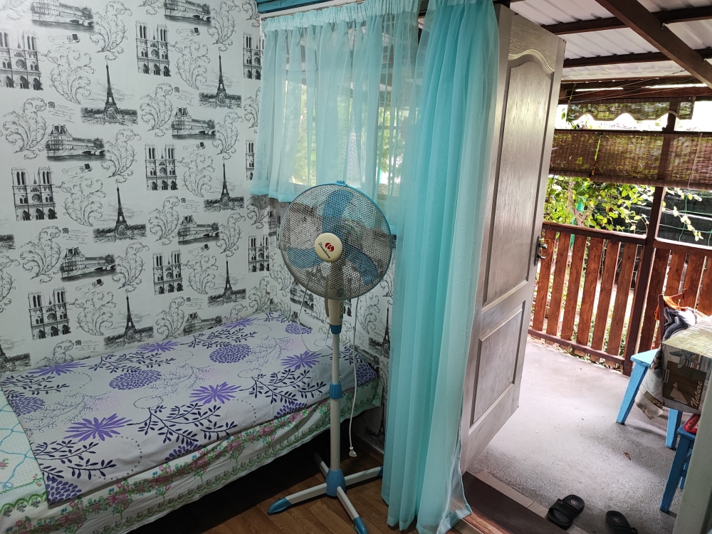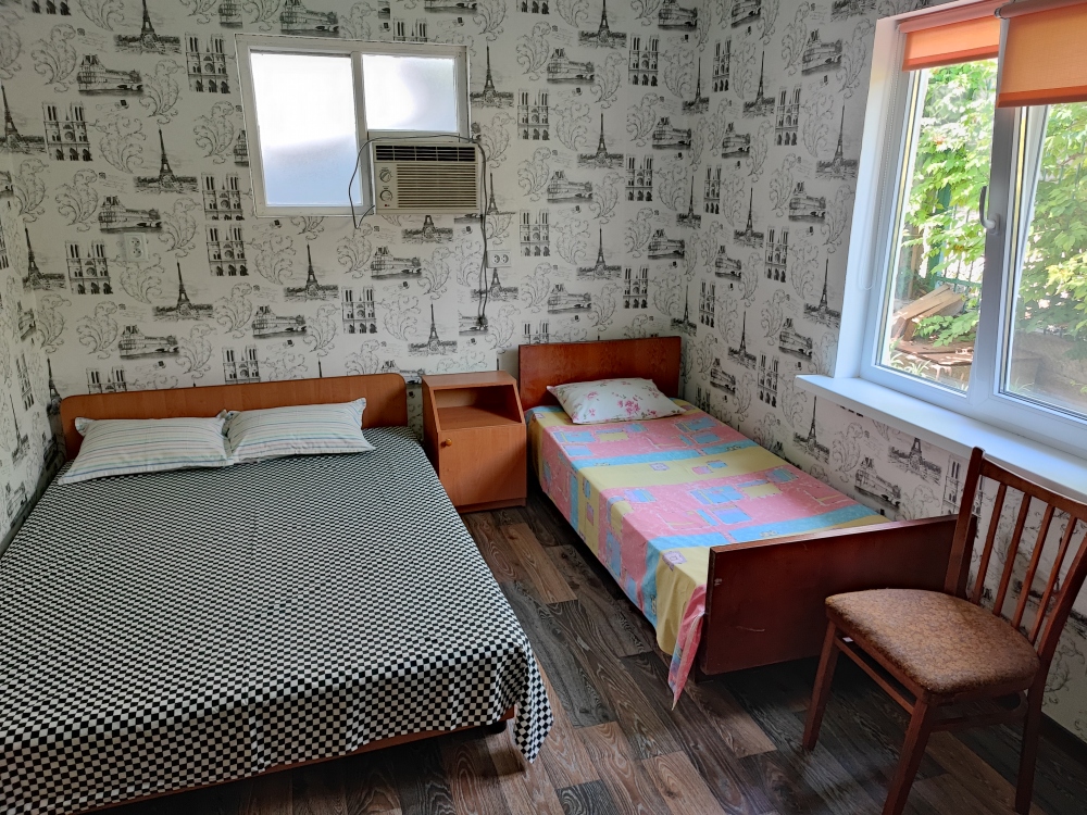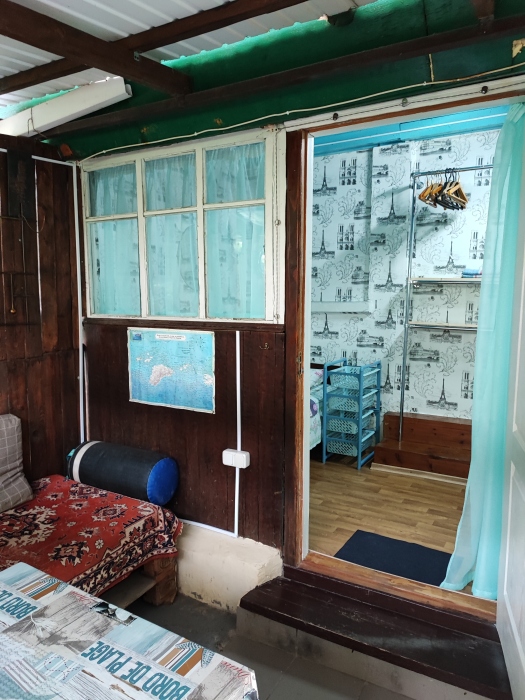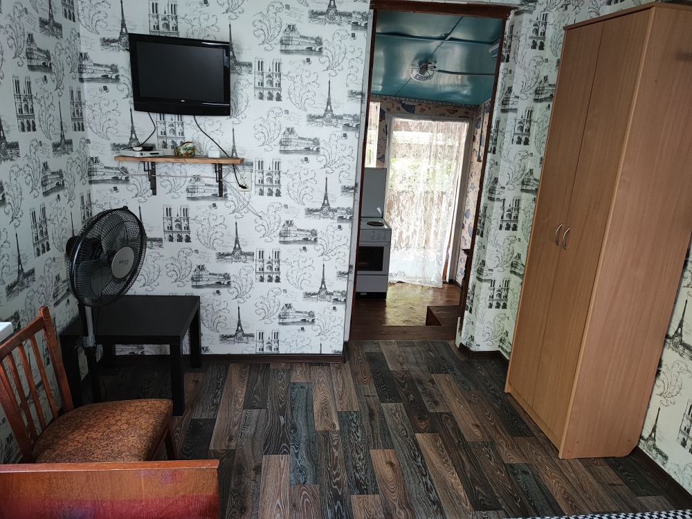 В первой комнате расположены две полноценные кровати 90*190,стеллаж для вещей,вентилятор.