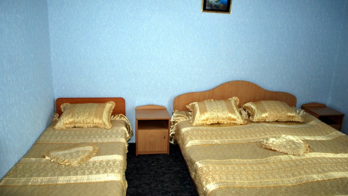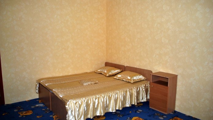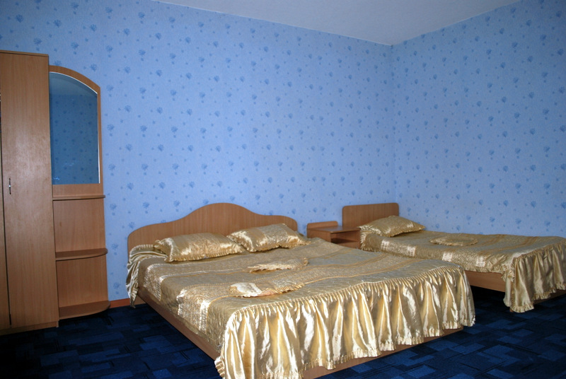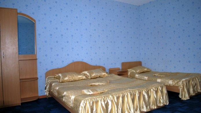 В номере кровати, тумбочки и шкаф с зеркалом.