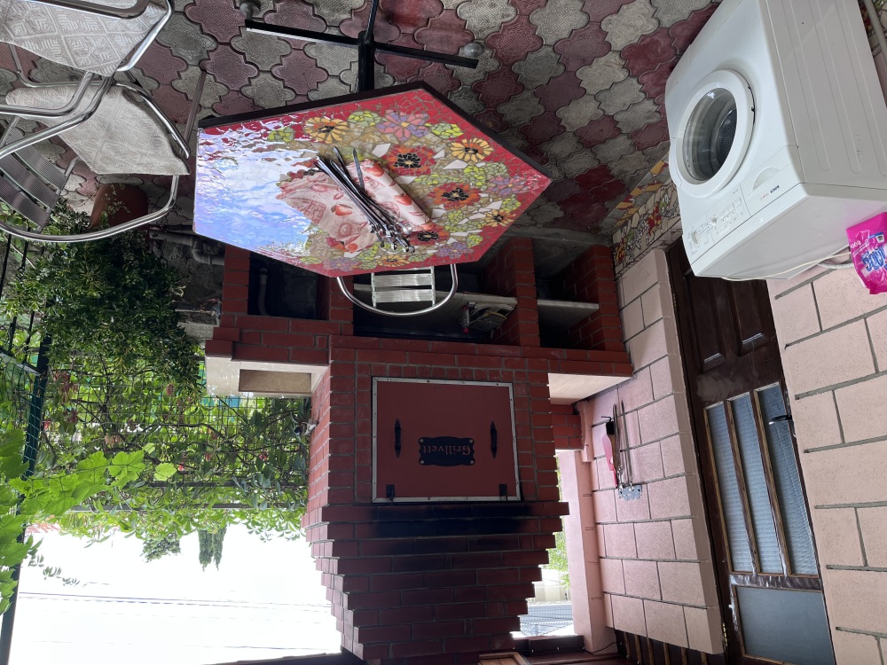 Во дворе стоит большой стол с зонтиком,уличные кресла и мангал.