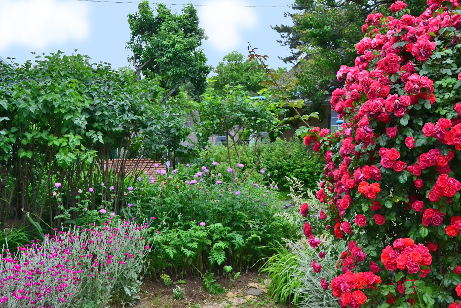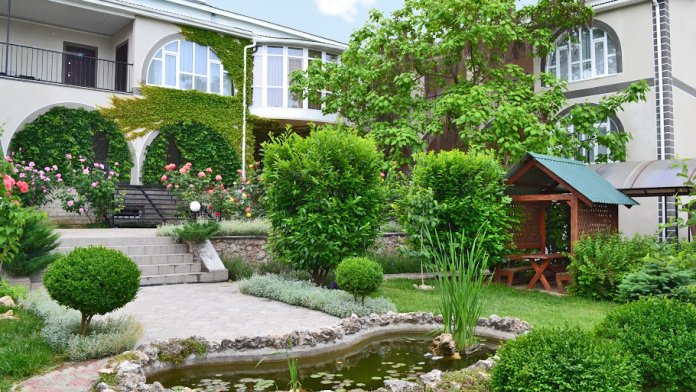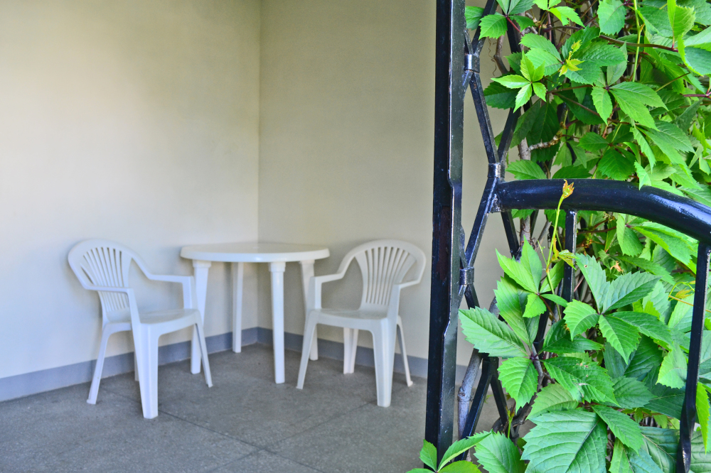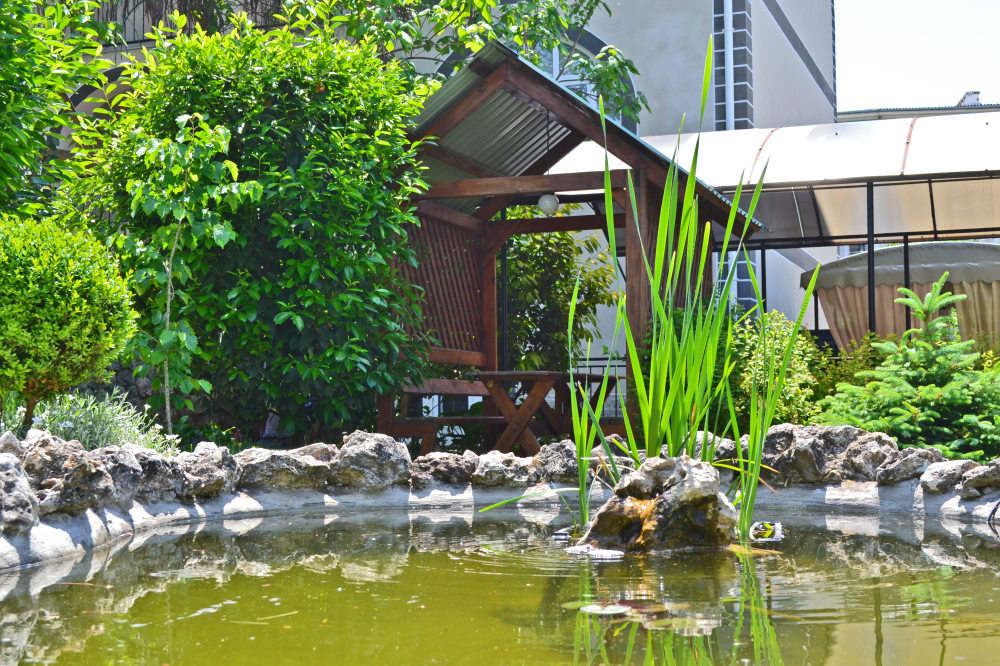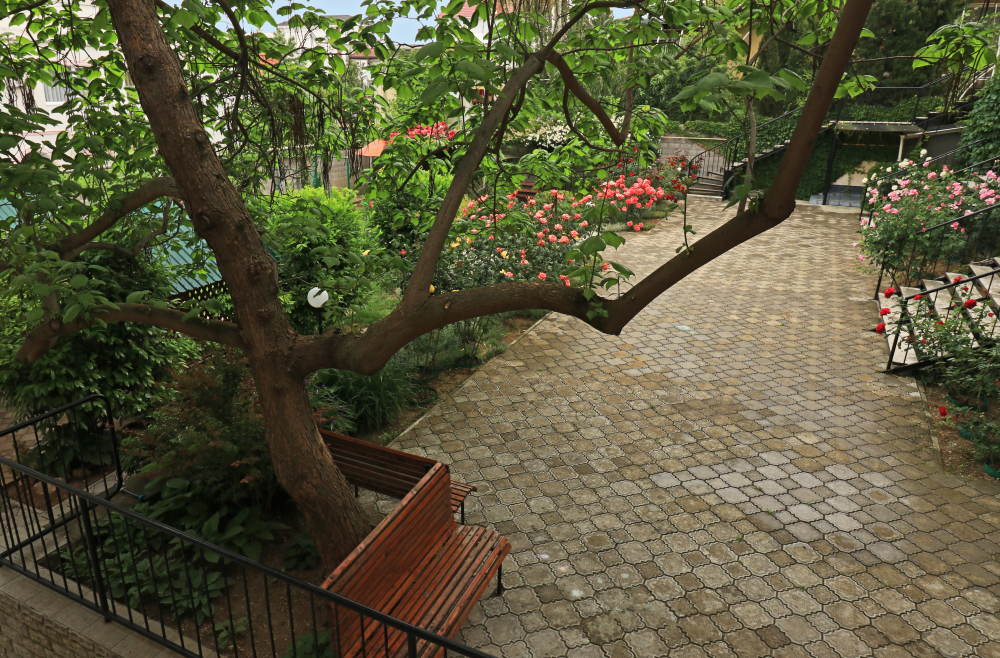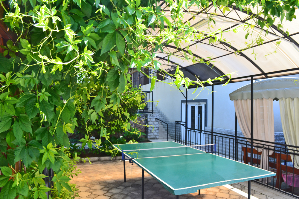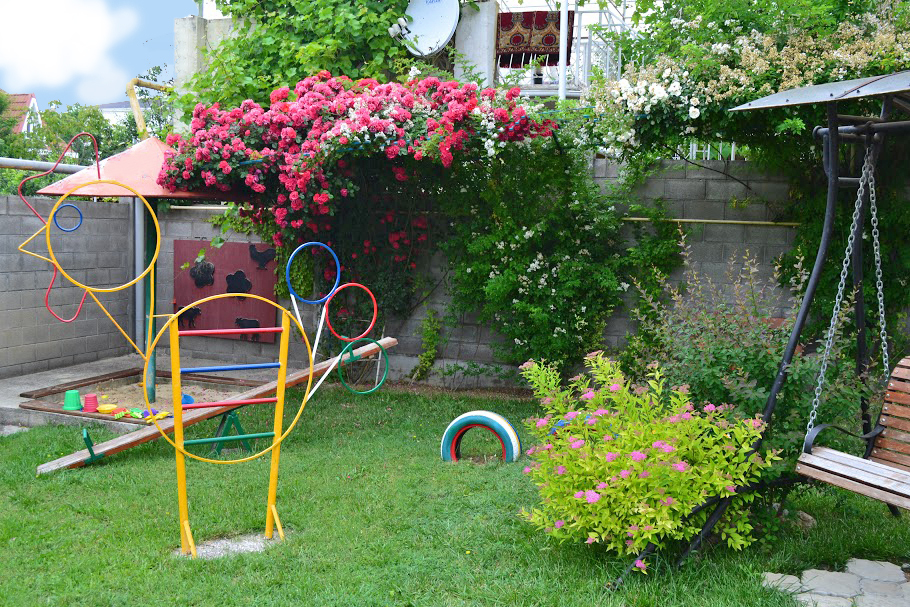 Гостевой дом располагает большой территорией с просторным, тенистым двориком, где есть разные зоны для отдыха. Там беседки для вечерних посиделок, теннисный стол, зона с мангалом, детская площадка с тихо журчащим фонтаном, розарий, качели и песочница для малышей.