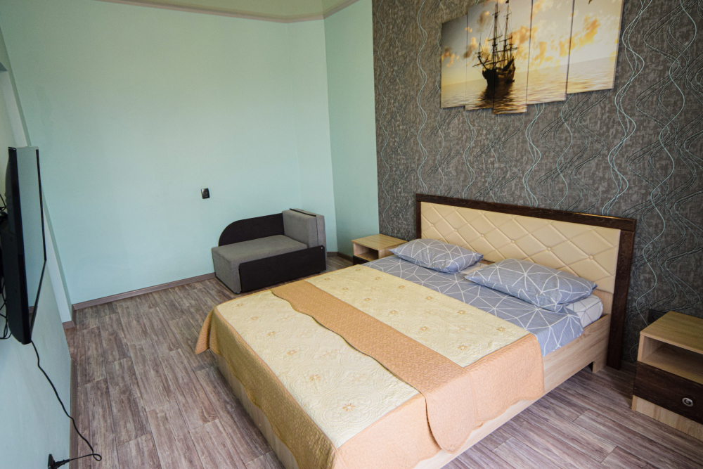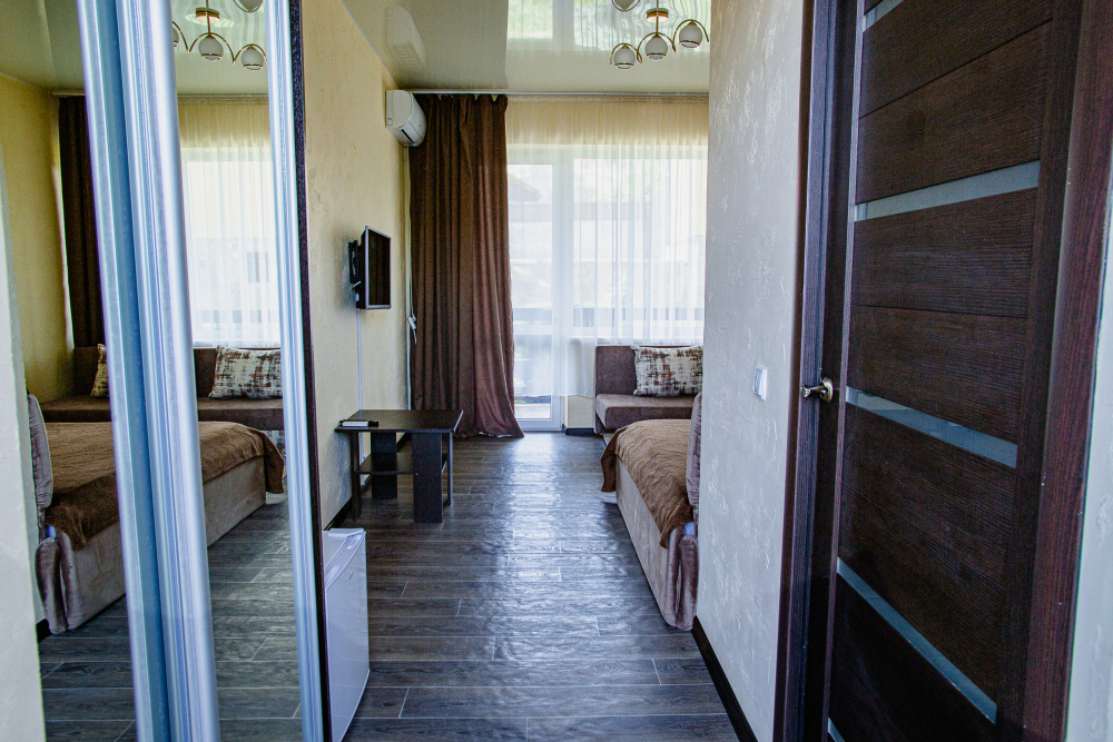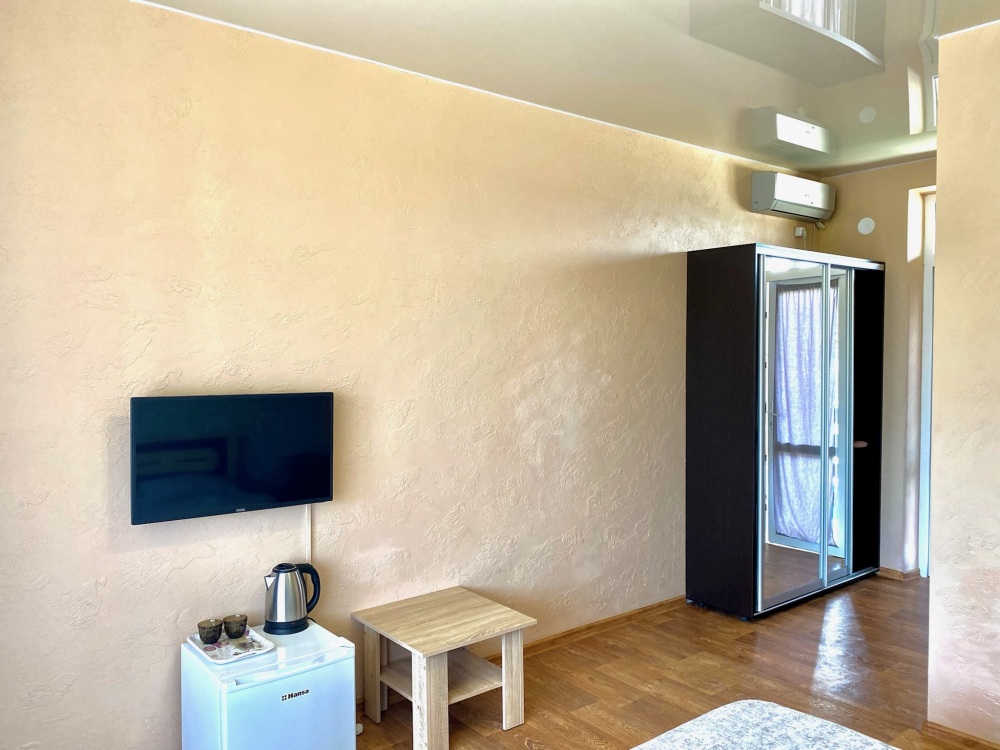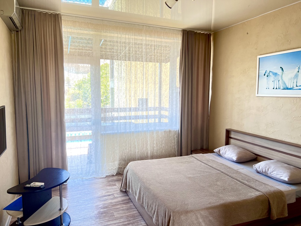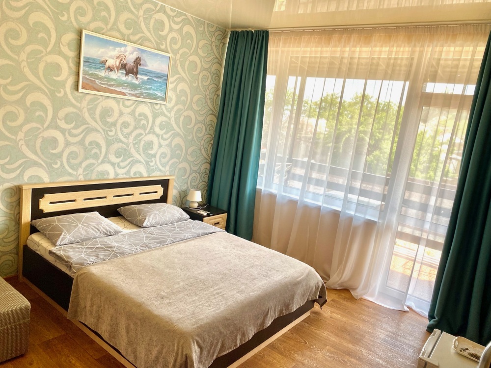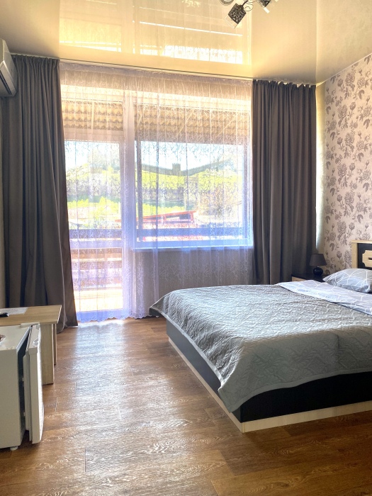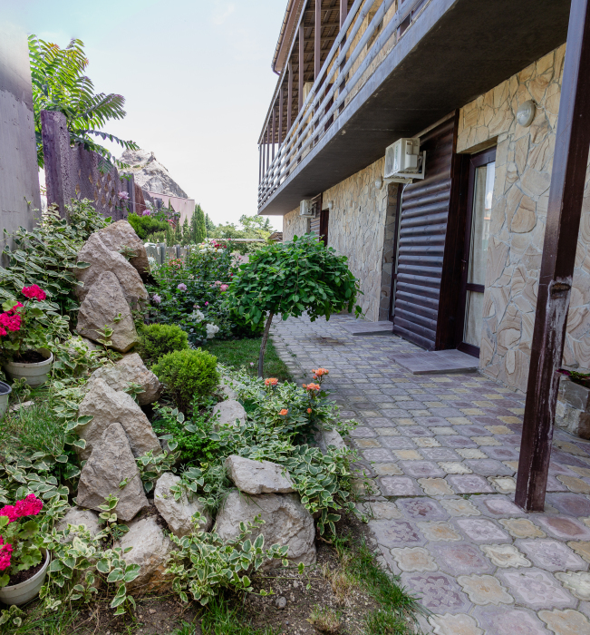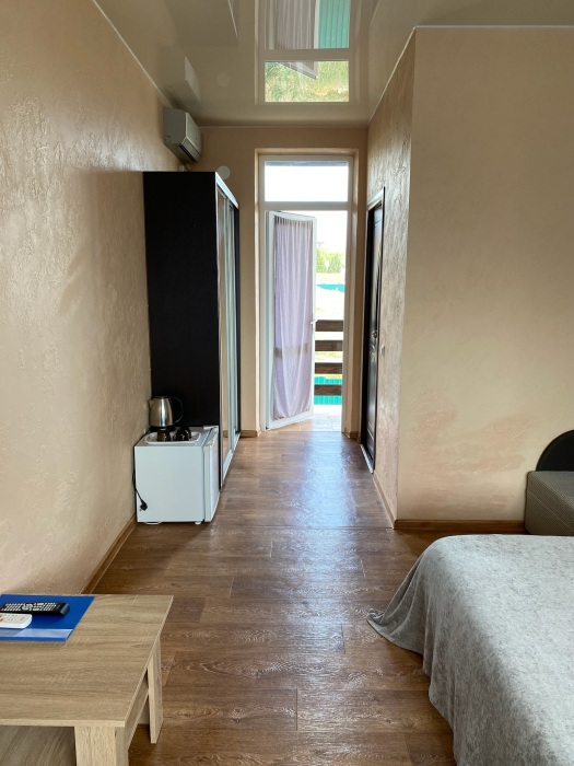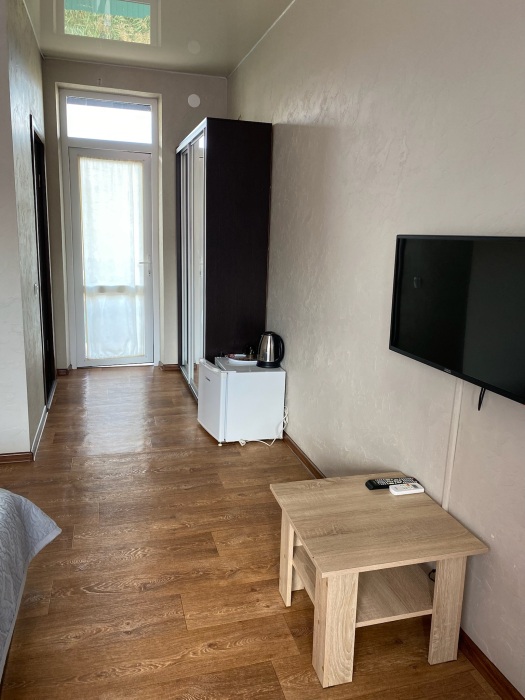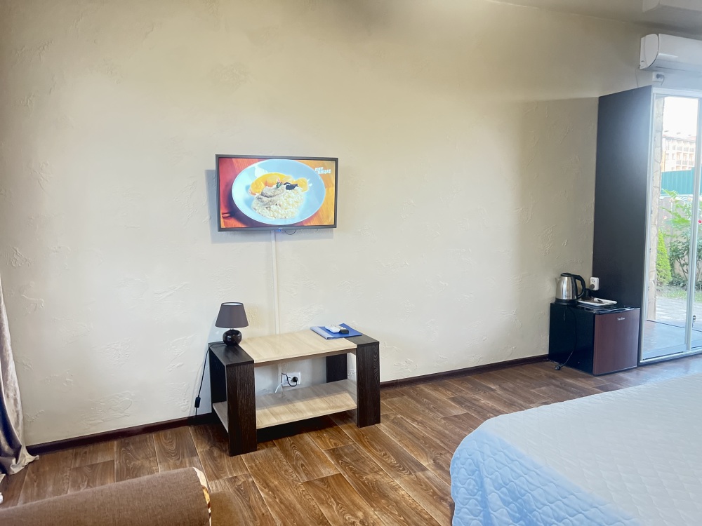 Номер находиться на первом этаже, оснащен кондиционером, телевизором с плоским экраном, холодильник, чайник, бельем и туалетными принадлежностями. В каждом номере ванная комната. Номер с отдельным входом, балкон с зоной отдыха, с видом на сад и на Генуэзскую Крепость.