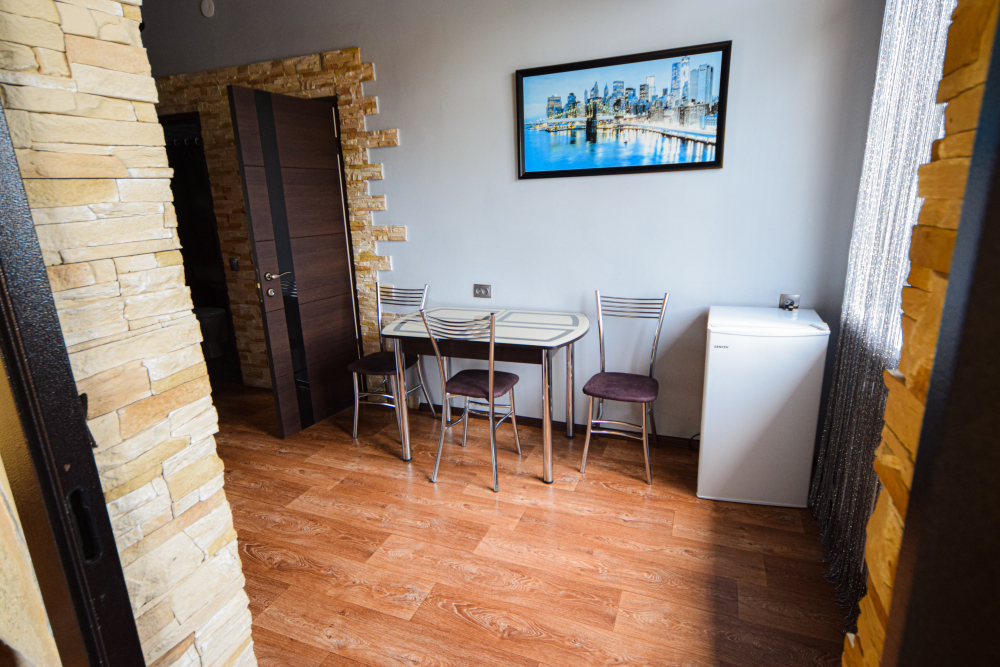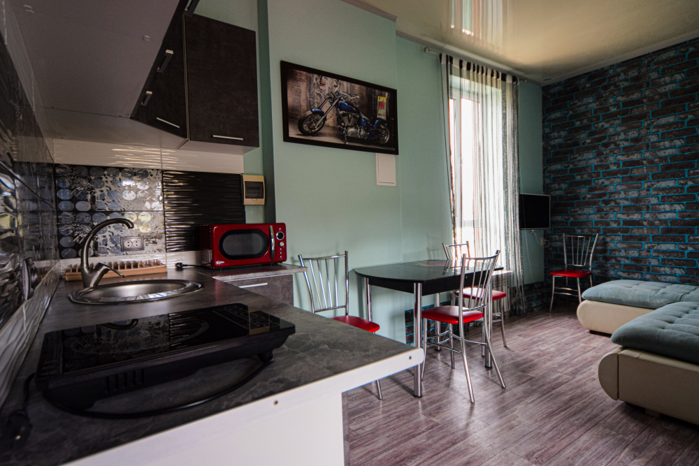Среди прочих удобств - общая кухня для самостоятельного приготовления со всем необходимым (микроволновая печь, плита чайник, посуда) с зоной отдыха.