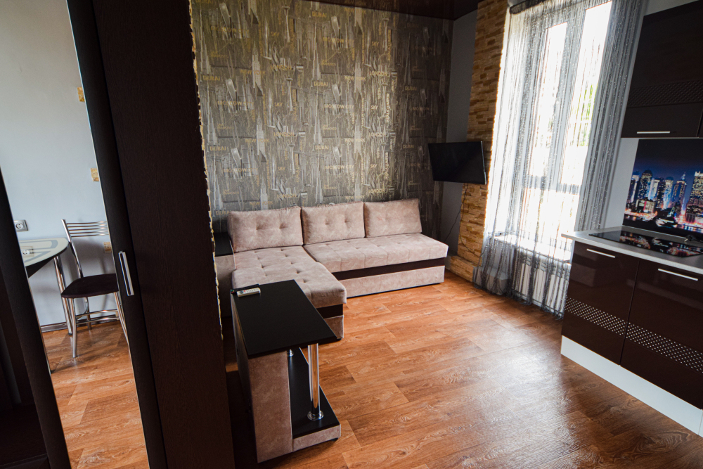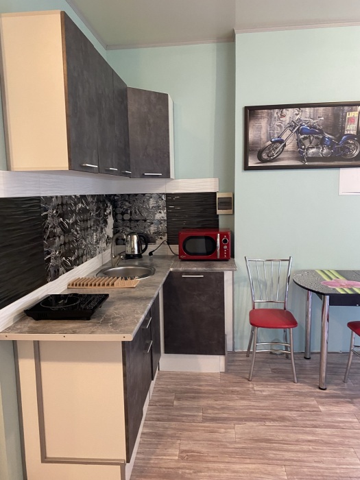 В номере своя кухня ( посуда, плита , микроволновая печь,чайник, холодильник