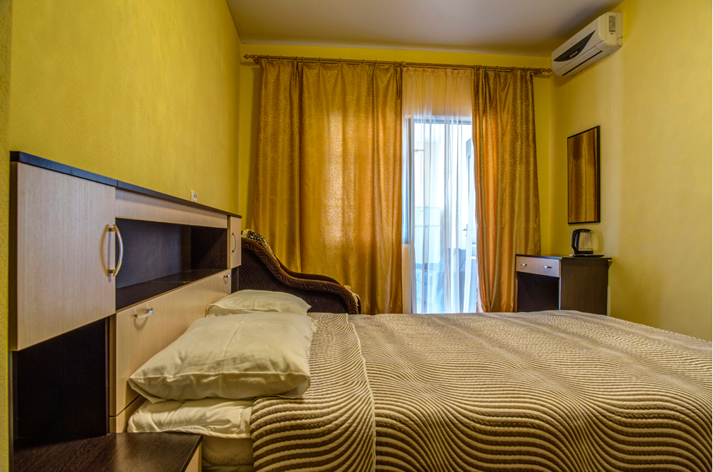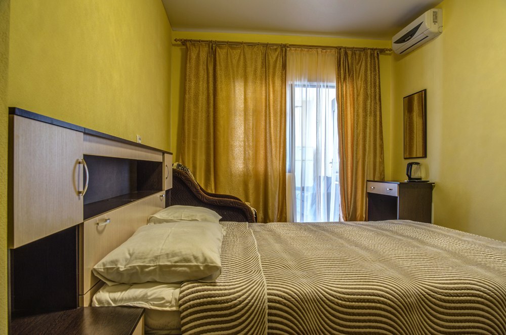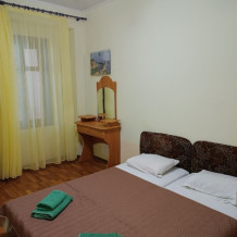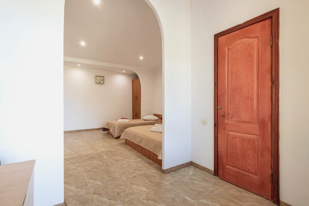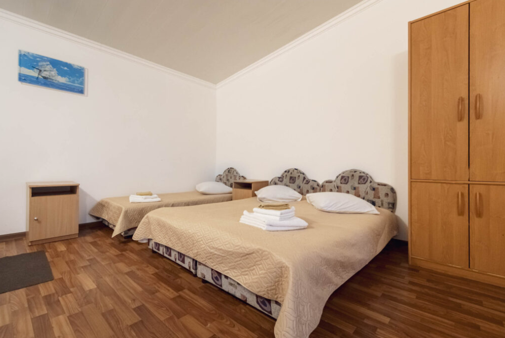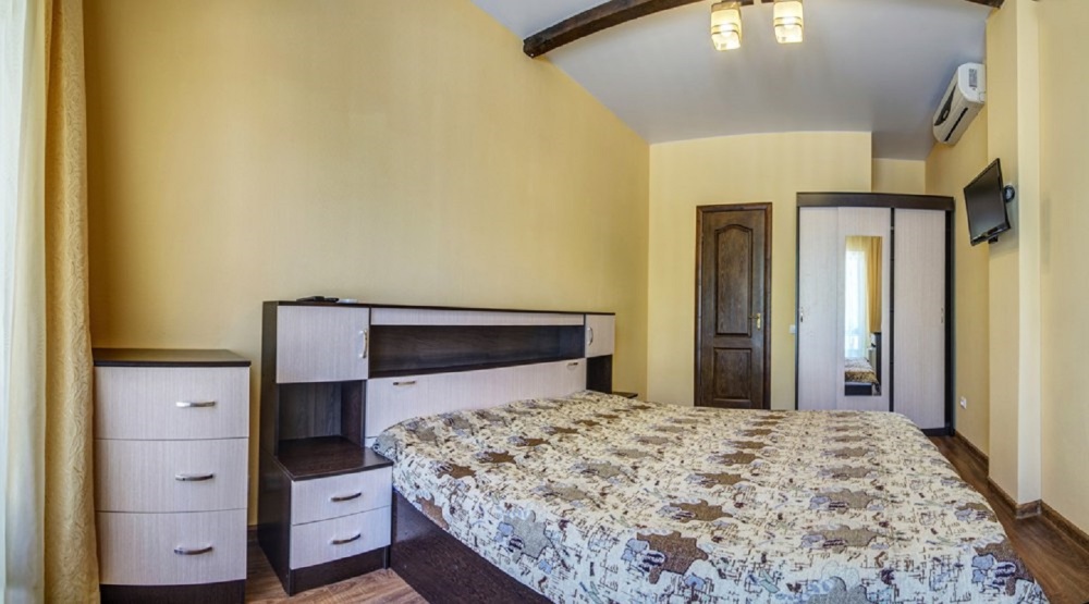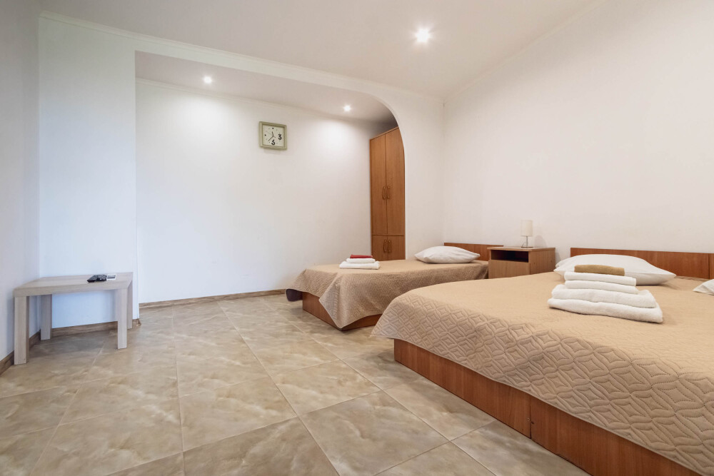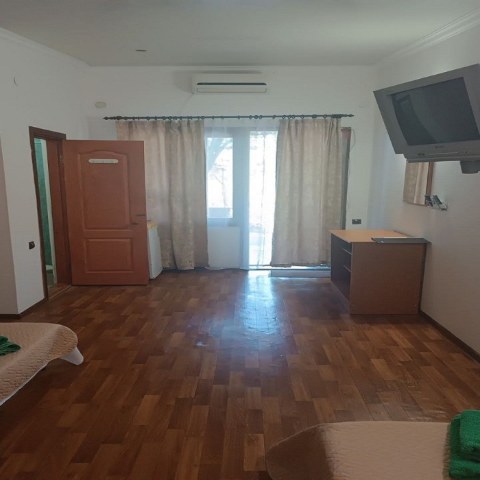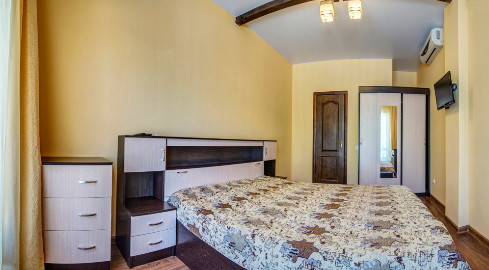 Номер двухкомнатный, вместимостью до 3 человек. Возможно доп. место. В номере санузел, кондиционер, телевизор, шкаф, туалетный столик, комод, кровати.