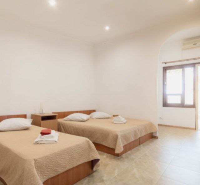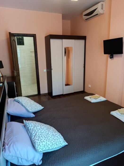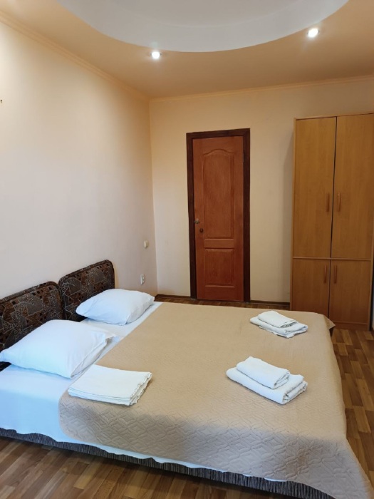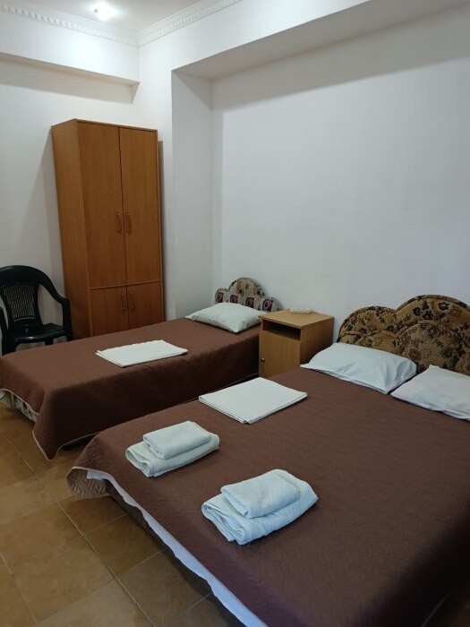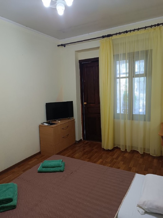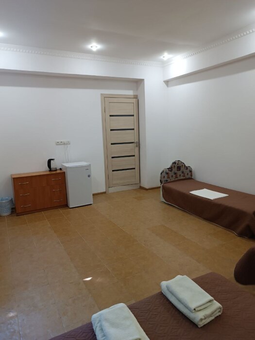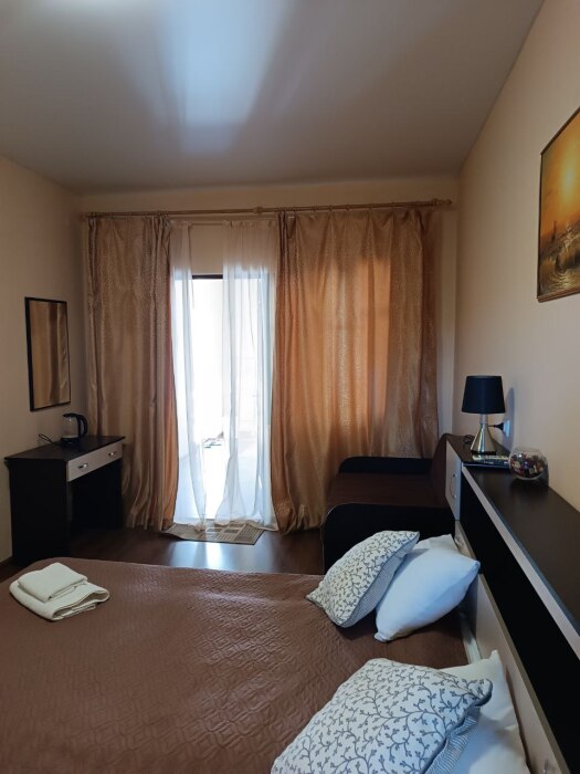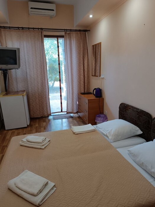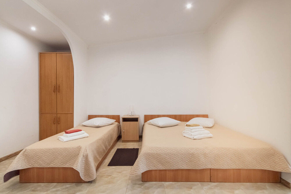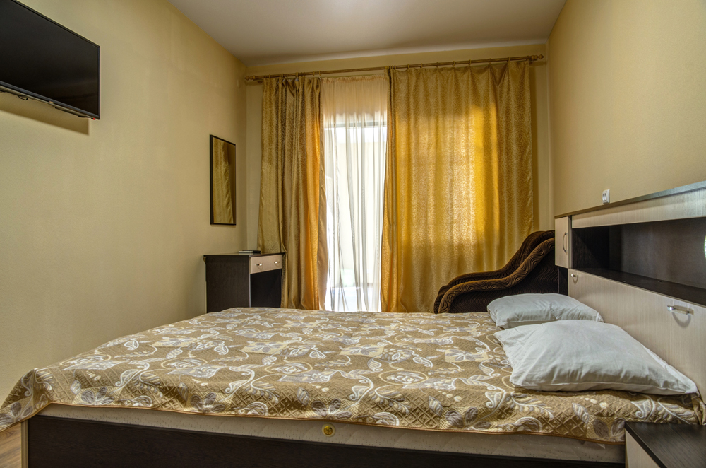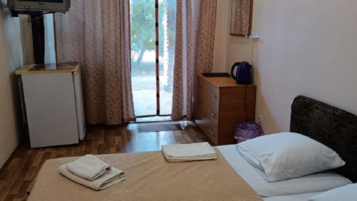 Номер двухкомнатный, вместимостью до 3 человек. Возможно доп. место. В номере санузел, кондиционер, телевизор, шкаф, туалетный столик, комод, кровати.