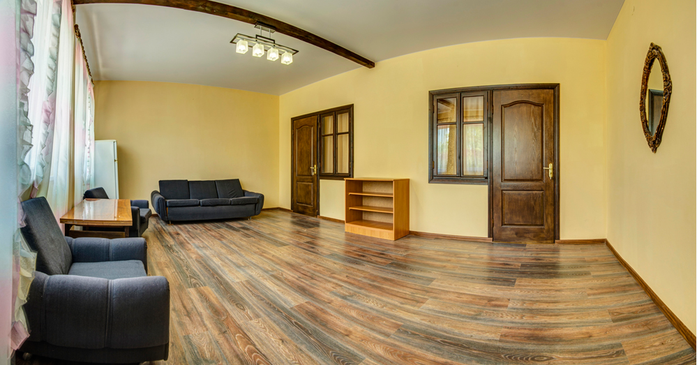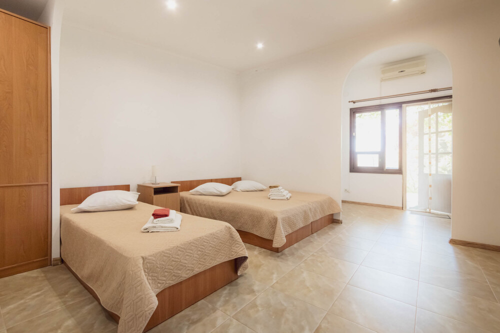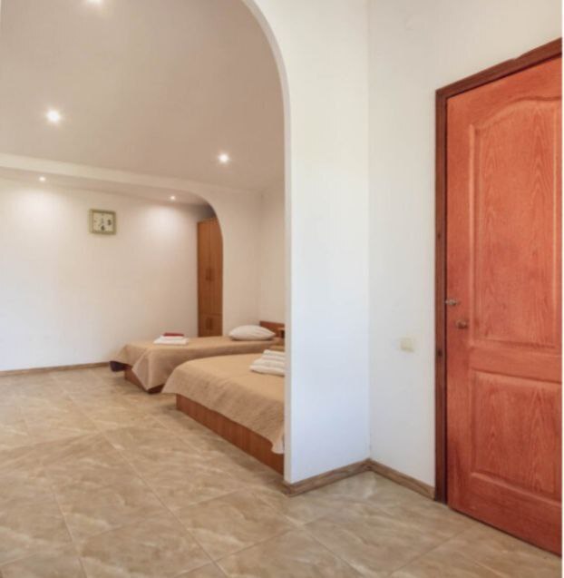 Большой холл c двумя двухместными номерами, в каждом номере доп. место. Номер для большой компании (до 6 чел.). Санузел, душевая кабина, кровати, шкаф, тумбочки, комод, холодильник, спутниковое телевидение, кондиционер (сплит-система), WiFi, большой балкон с зоной отдыха и видом на море.